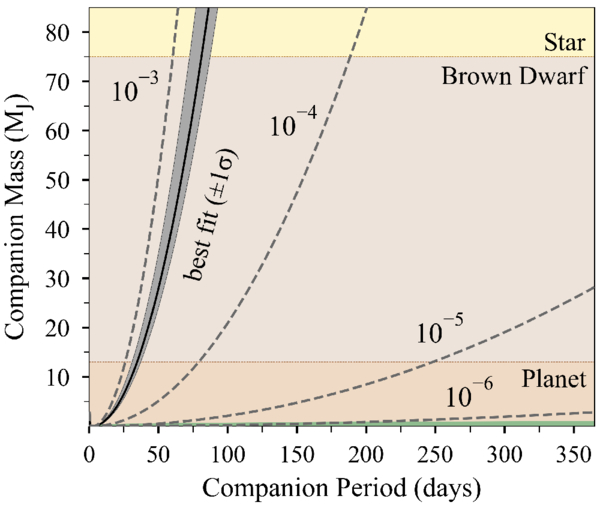 Similar to Figure 6, but extended to include orbital periods up to 1 yr. The three mass categories—planet, brown dwarf, and star—are illustrated along the y-axis. The green shaded region again denotes the RV detection limit, same as in Figure 6.