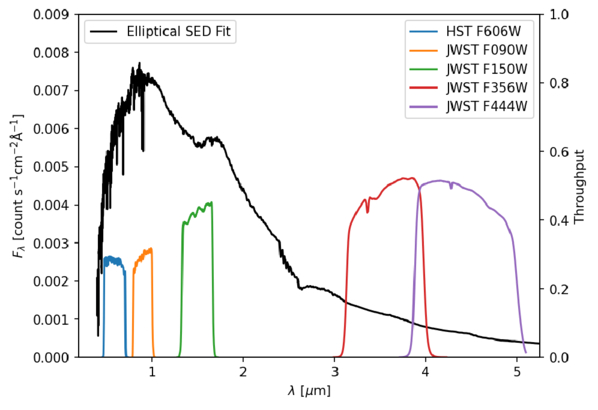 SED for an elliptical galaxy (black) and the filter throughput for each of the five broadband filters used in the approximation of α. The filter throughputs can be found from the SVO Filter Profile Service (https://svo2.cab.inta-csic.es/theory/fps).
