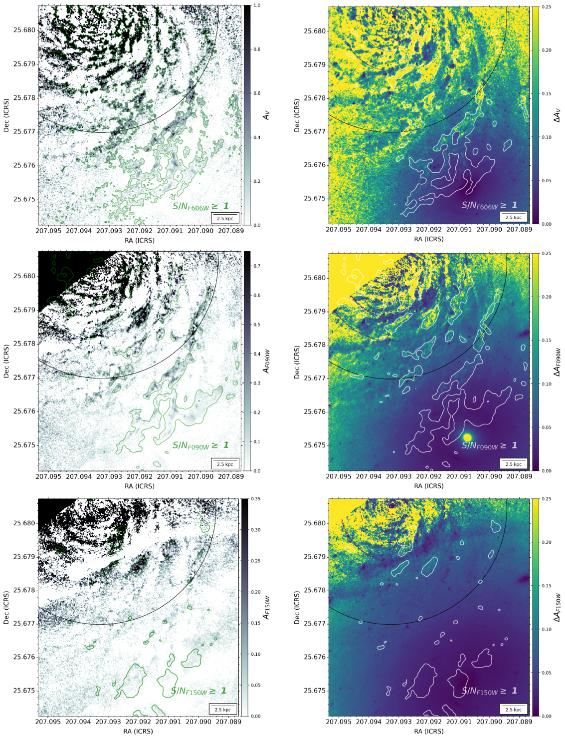 Attenuation maps (Aλ; left side) and their respective uncertainties (ΔAλ; right side). Top row: attenuation calculated from the HST F606W filter, whose reference wavelength is 0.606 μm. Middle row: attenuation calculated from the JWST F090W filter, whose reference wavelength is 0.90 μm. Bottom row: attenuation calculated from the JWST F150W filter, whose reference wavelength is 1.50 μm. All maps are overlaid (green for Aλ and white for ΔAλ) with their respective S/N maps (that is, the HST F606W and JWST F090W and F150W filters each have their own S/N maps, not given in this paper) as a contour such that S/Nλ ≥ 1. All contour maps are smoothed over (3 pixels across). Also overlaid in black is the Petrosian radius (RP = 12 kpc). These attenuation structures are well outside the stellar disk.