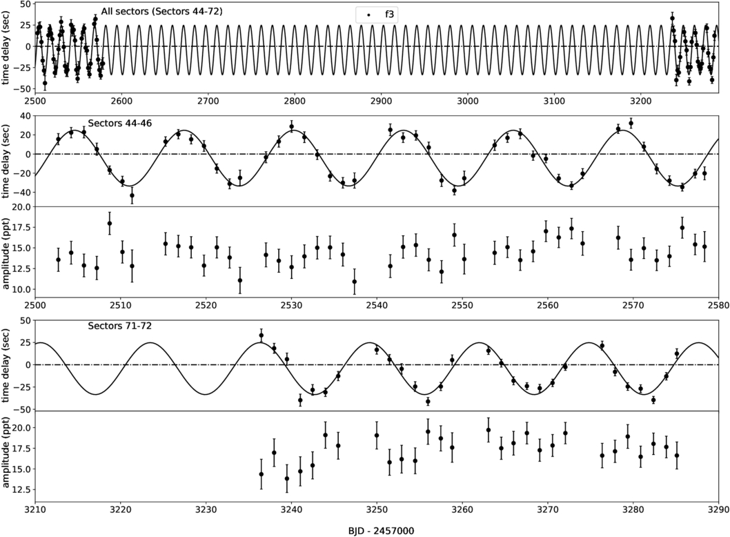 Pulsation timing analysis of TIC 69298924 using f3 (the largest amplitude pulsation). (Row1) Pulsation timing analysis of all available sectors, Sectors 44–46, and 71–72. (Row 2 and 3: top) The pulsation timing analysis of Sectors 44–46 and Sectors 71–72. The solid curve shows the best-fit sinusoid. (Row 2 and 3: Bottom) The pulsation amplitude variations of each sector.