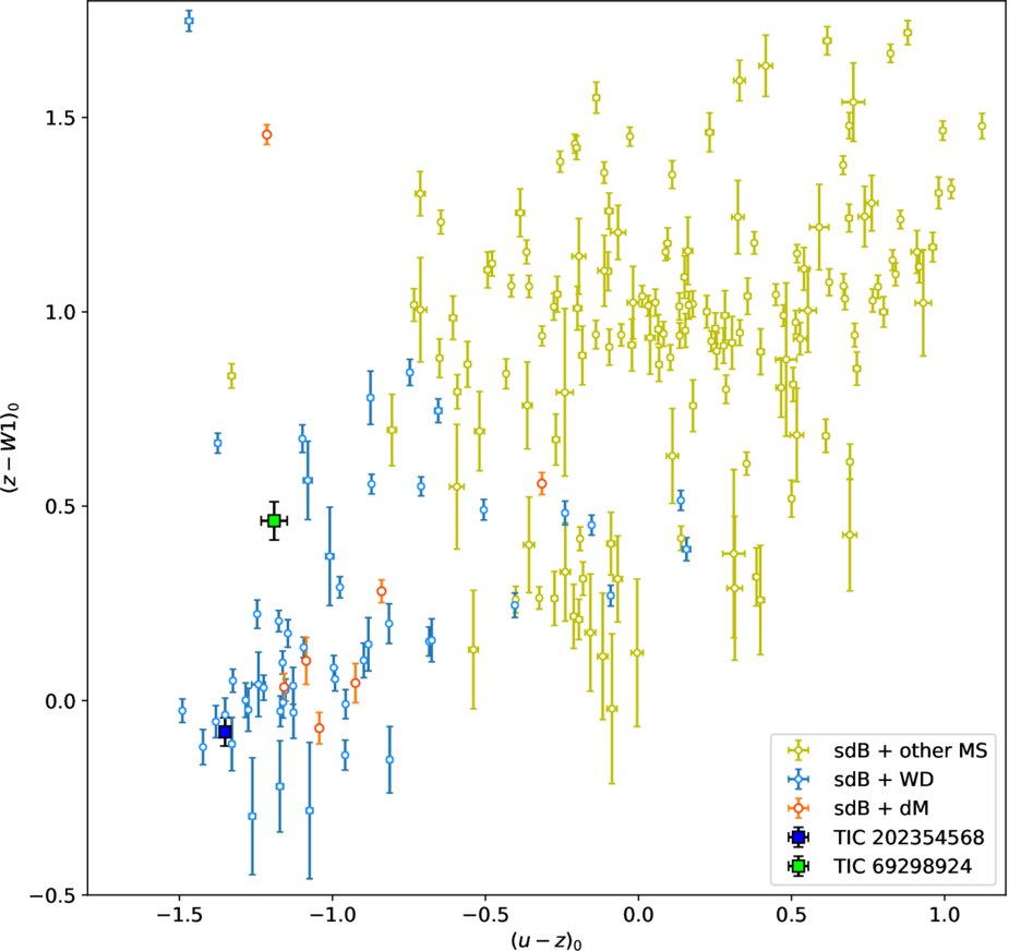 Color–color diagram for all available sdB binaries in the (S. Geier 2020) database. TIC 202354698 and TIC 69298924 are indicated by filled squares.