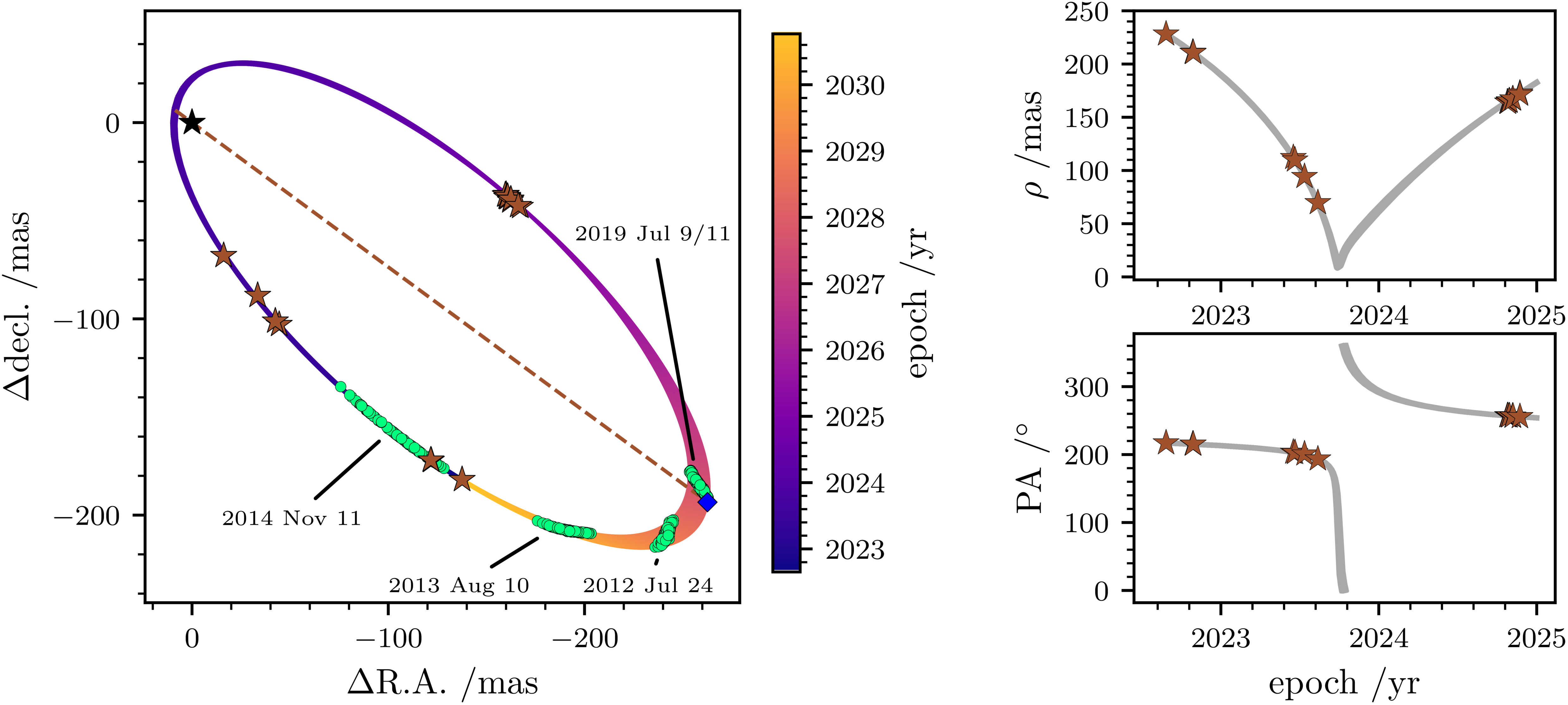 One hundred orbits randomly selected from the posterior distribution computed by an MCMC fit to relative astrometry (brown stars). Left: orbits show the displacement of the companion κ Tuc Ab in decl. and R.A. (Δdecl., ΔR.A.) with the primary star κ Tuc Aa in the coordinate center (black star). Colors indicate the position of κ Tuc Ab along the orbits, starting with our first detection on 2022 August 27, and ending after one orbital period. The dashed brown line connects the peri- and apoastron for the best-fit orbital parameters. The blue diamond indicates the tentative position for 2019 July 9/11, which was not used to constrain the orbit. In several past PIONIER and MATISSE observations, κ Tuc Ab was not detected (see Section 5.3), and green points show for the selected orbits its predicted past positions at these epochs that are denoted by text insets. Right: gray curves show for the same orbits as on the left the companion separation ρ and the PA of κ Tuc Ab with PA = 0° to the north and increasing counterclockwise. Figure created with a modified orbitize! plot routine.