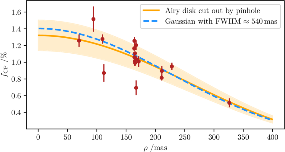 Attenuated flux ratios fCP (red points) as measured directly from the interferometric closure phases, compared to the prediction assuming transmission loss by spatially filtering an Airy disk separated from the pinhole center by ρ (solid orange line). The nonattenuated flux ratio for ρ = 0 mas is computed from the mean of the flux ratios corrected from attenuation; the faint orange region covers their standard deviation. This treatment is consistent with a Gaussian description of the attenuation (dashed blue line).