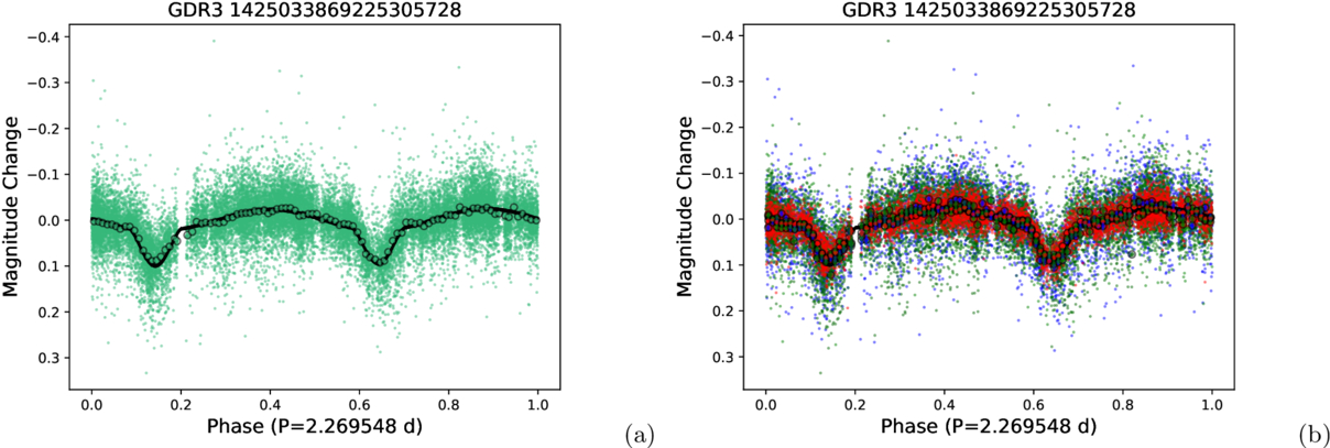 The change in magnitude vs. phase plot of GG Dra (GDR3 1425033869225305728, Gaia G magnitude 8.6141). We determined its period to be 2.2695484 days from combining TESS and our data. (a.) Our light curve points (teal) are binned (circle teal points) and folded by the period. The corresponding TESS light curves (sectors 16, 23, 25, 50, 51, 52, 77, 78, 79, and 83, black points) are included. (b.) The binary system showed no color dependence (no obvious variance in red, blue, or green data points).