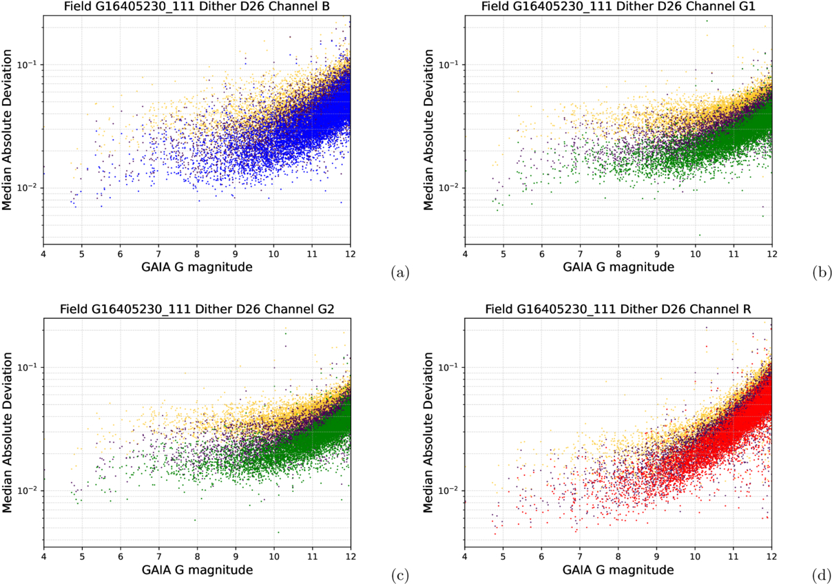 The scatter (median absolute deviation from the median (MAD)) of the individual channel light curves vs. GAIA G magnitude before EPD (only magnitude fitting, indicated by yellow points), after EPD but before TFA (indicated by purple points), and after TFA (indicated by their corresponding channel color (B (blue)(a), G1 (green)(b), G2 (green)(c), R (red)(d)) points). These plots are for dither pattern D26, field G111. These show the overall improvements from our postprocessing steps.