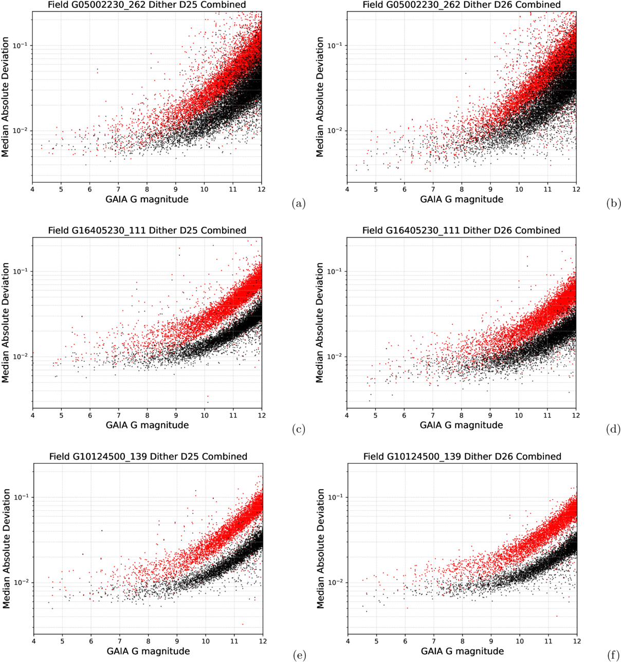 The scatter (median absolute deviation from the median (MAD)) of the combined channel completely processed (i.e., after performing magnitude fitting, EPD, and TFA steps) light curves vs. GAIA G magnitude (black points) for fields G262 (a), (b), G111 (c), (d), and G139 (e), (f) for dither patterns D25 (left) and D26 (right). For comparison, the red channel scatter is also shown (red points)