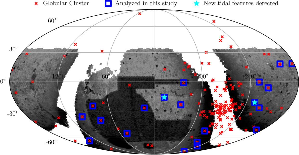 The density of sky coverage, plotted in equatorial coordinates (R.A. and decl.), with the DECam camera and the location of 170 globular clusters (GCs) from E. Vasiliev & H. Baumgardt (2021) and the overlap with the DELVE footprint. The Dark Energy Survey (DES) covers the irregular polygon of higher star density in the lower center of the figure. The rest of the coverage is from the DELVE survey. GCs are denoted with a red cross, and those that had enough high-quality data that we could search for extratidal envelopes have a blue square around the cross. NGC 5897 (the GC with a newly detected envelope) and NGC 7492 (which has conflicting reports in the literature and for which we detect an envelope), are shown as cyan stars with coordinates ﹩(\alpha =229\mathop{.}\limits^{^\circ }35,\delta =-21\mathop{.}\limits^{^\circ }01)﹩ and ﹩(\alpha =347\mathop{.}\limits^{^\circ }11,\delta =-15\mathop{.}\limits^{^\circ }61)﹩, respectively.