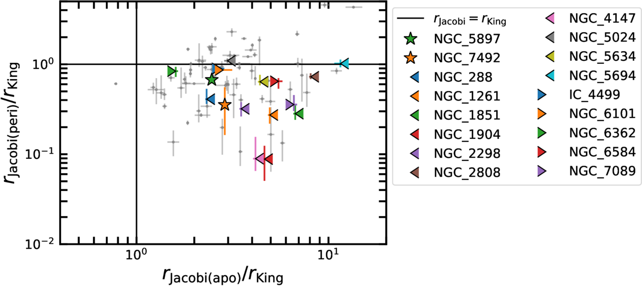 Comparison of the Jacobi radius at apocenter and pericenter with each GC’s King limiting radius. All but one of the systems studied in this work have a Jacobi radius at pericenter that is smaller than its limiting radius.