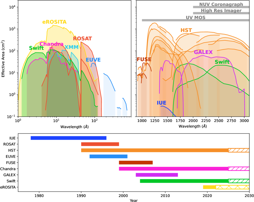 Effective area curves for all observatories used in this analysis. Gray bars mark the tentative wavelength coverage for HWO instruments: the UV Multi-Object Spectrograph (MOS; ∼1000–10000 Å), High Resolution Imager (∼2000–25000 Å), and possible NUV coronagraph (∼2000–4000 Å). Top-left panel: effective area as a function of log wavelength for X-ray to EUV instruments. Top-right panel: effective area in the UV, shown in linear wavelength space. (Only one effective area curve was available for IUE.) Bottom panel: operational lifetimes of each observatory, ordered by commissioning date. Solid bars indicate periods of active observation; hatched extensions denote projected future lifetimes. We note that eROSITA operations have been paused since early 2022.