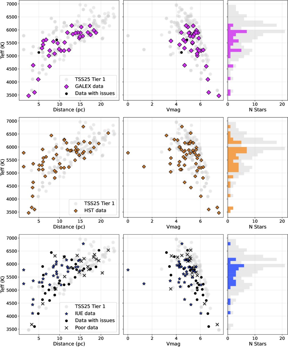 Same as Figure 10. Top panels: GALEX; middle panels: HST; bottom panels: IUE.