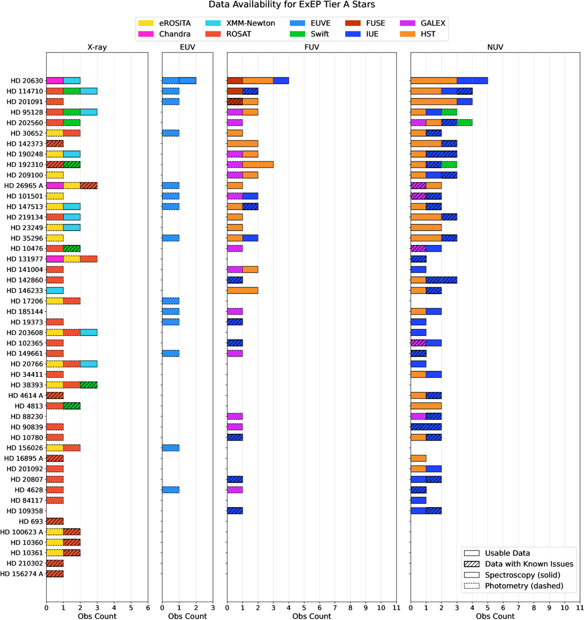 Data availability across X-ray, EUV, FUV, and NUV wavelength ranges for ExEP Tier A stars, ordered by total number of observations (highest at top). Each colored block represents an individual observation, color-coded by observatory. Solid blocks indicate usable data, while hatched blocks denote flagged data with known issues. These include observations of unresolved binaries (Swift, XMM-Newton), upper limits (Swift), or data requiring linear corrections (GALEX). Blocks with solid outlines represent spectroscopic measurements (including APEC model spectra for Chandra and XMM-Newton observations), while dashed outlines represent photometry. Subplots reflect different wavelength bands.
