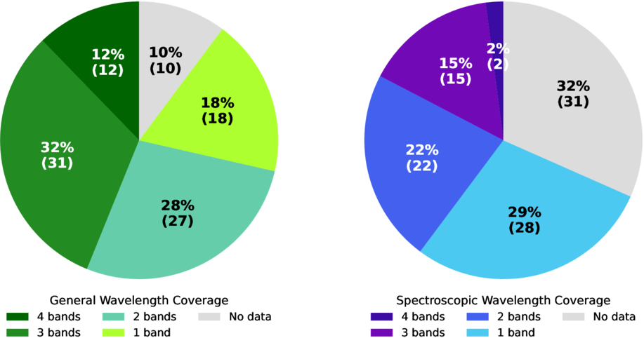 Left chart: distribution of stars by the number of wavelength bands (X-ray, EUV, FUV, NUV) with usable observations (either spectroscopy or photometry). Each star is counted once based on how many distinct bands it has good data in. The “No data” category captures stars that lack usable observations in any of the four bands, this includes stars that are limited to data with “known issues.” Both the percentage of the full target sample and the total number of stars are indicated within each wedge. Right chart: the distribution of stars limited to spectroscopy.