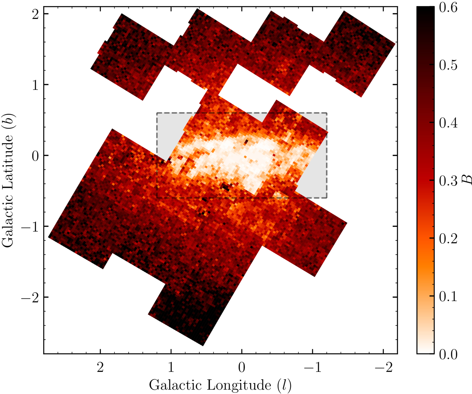 Mapping of the exponential gradient parameter, B, from our fits in UKIRT fields. We advise caution when using pixels with B < 0.2.