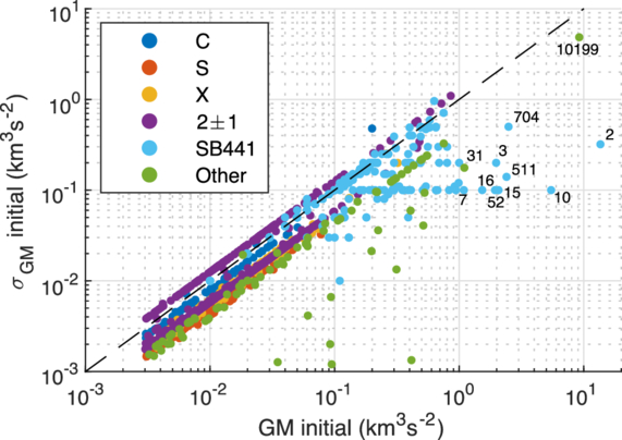 Initial mass values and uncertainties for the main-belt asteroids, Trojans and Centaurs in the perturber list. The color code indicates the taxonomic type, the masses from R. S. Park et al. (2021) and uncertainties from D. Farnocchia et al. (2021; SB 441), the set for which we assume 2 ± 1 g cm−3, and other sources. Objects of GM > 1 km3s−2 are labeled. The full list is in available as supplementary information with an excerpt in the Appendix in Table 5.