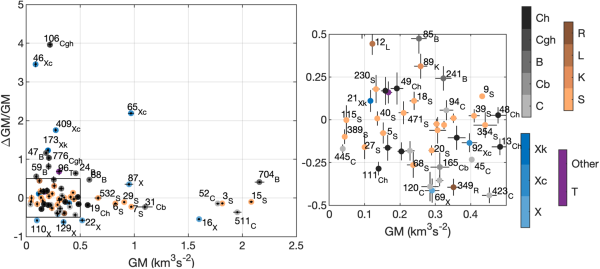 Relative difference (GMtax − GMfin)/GMfin between GM estimates via taxonomy and final estimates. We only include estimates with SNR > 10, color coded by taxonomic types. The right panel is a detailed view of the region of GM < 5 km3 s−2 and ﹩\left|{\rm{\Delta }}{\rm{GM/GM}}\right|﹩ < 0.5. The error bars show uncertainties and relative uncertainties (1σ) of the final estimates.