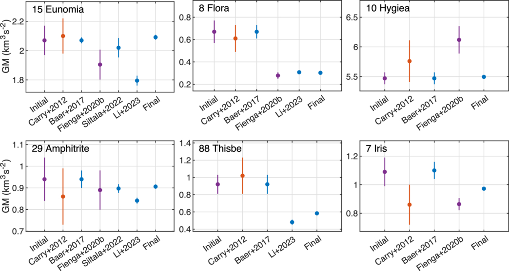 Comparison of initial and final mass estimates to the literature. The references are B. Carry (2012; Carry+2012), J. Baer & S. R. Chesley (2017; Baer+2017), A. Fienga et al. (2020a; Fienga+2020b), L. Siltala & M. Granvik (2021) or L. Siltala & M. Granvik (2022; Siltala+2022), and F. Li et al. (2023; Li+2023).