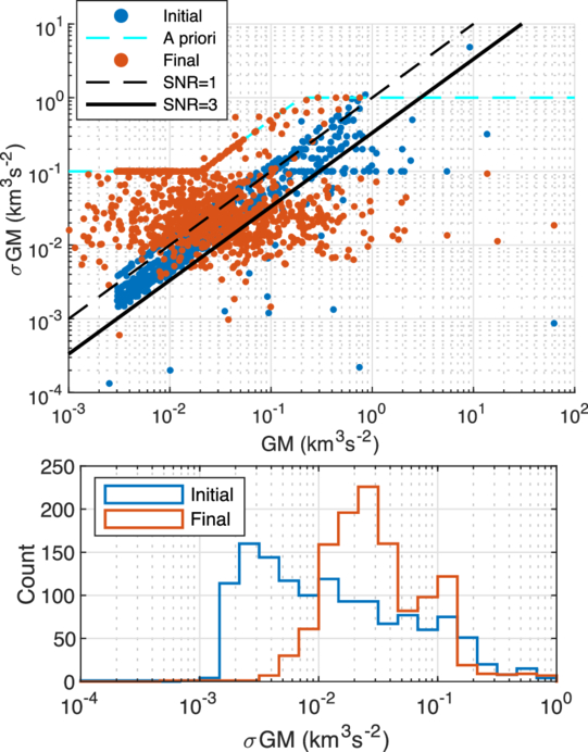 Initial, a priori or prefit (Pre) and a final mass estimates of main-belt asteroids, Trojans and Centaurs. The bottom panel shows the initial and final uncertainties of main-belt asteroids.
