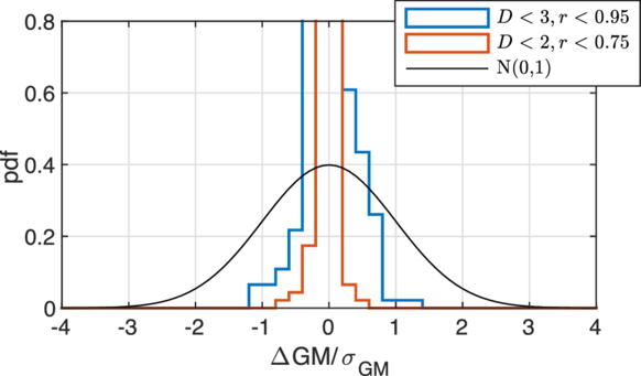 Difference in GM estimates when varying criteria for inclusion in the weighted mean. D is the maximum threshold to reject outliers as given by Equation (5). r is the reduction in uncertainty required to consider the test asteroid for the weighted mean. The nominal is 10% and we show the estimates for 5% and 25% reduction.