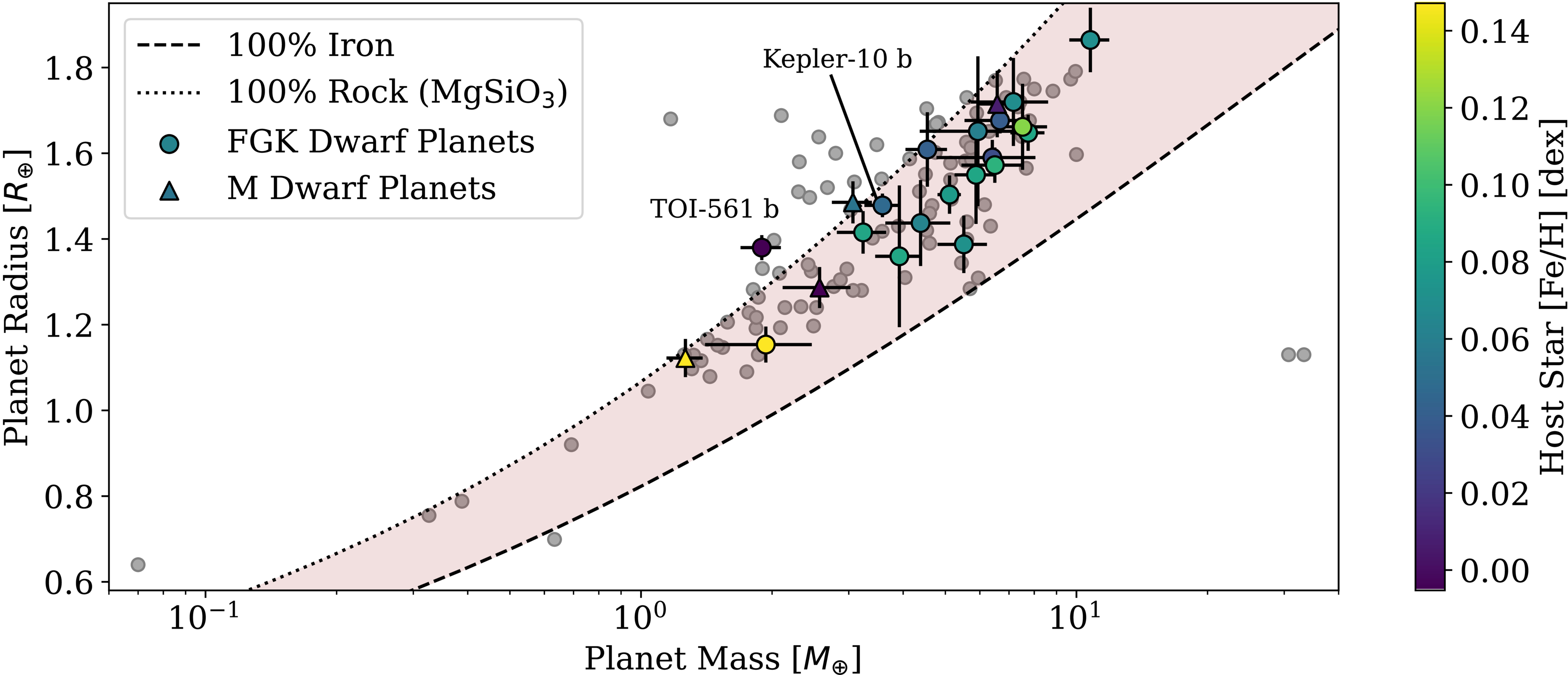 All small (RP ≤ 1.8 R⊕), rocky planets from the Exoplanet Archive (J. L. Christiansen et al. 2025) with <30% fractional radius and mass uncertainties (gray points). Planets with masses and radii consistent with a rocky composition (pure iron to pure MgSiO3 rock) are contained within the brown shaded region (L. Zeng et al. 2019). Our rocky planet sample with host star abundances from SDSS-V is shown in color, which corresponds to host star [Fe/H]. Planets hosted by FGK dwarfs are marked as circles, while planets hosted by M dwarfs are marked as triangles. The one planet not contained within the L. Zeng et al. (2019) region is TOI-561 b, the only high-confidence thick disk planet in our sample. We also label Kepler-10 b, another possible thick disk planet.