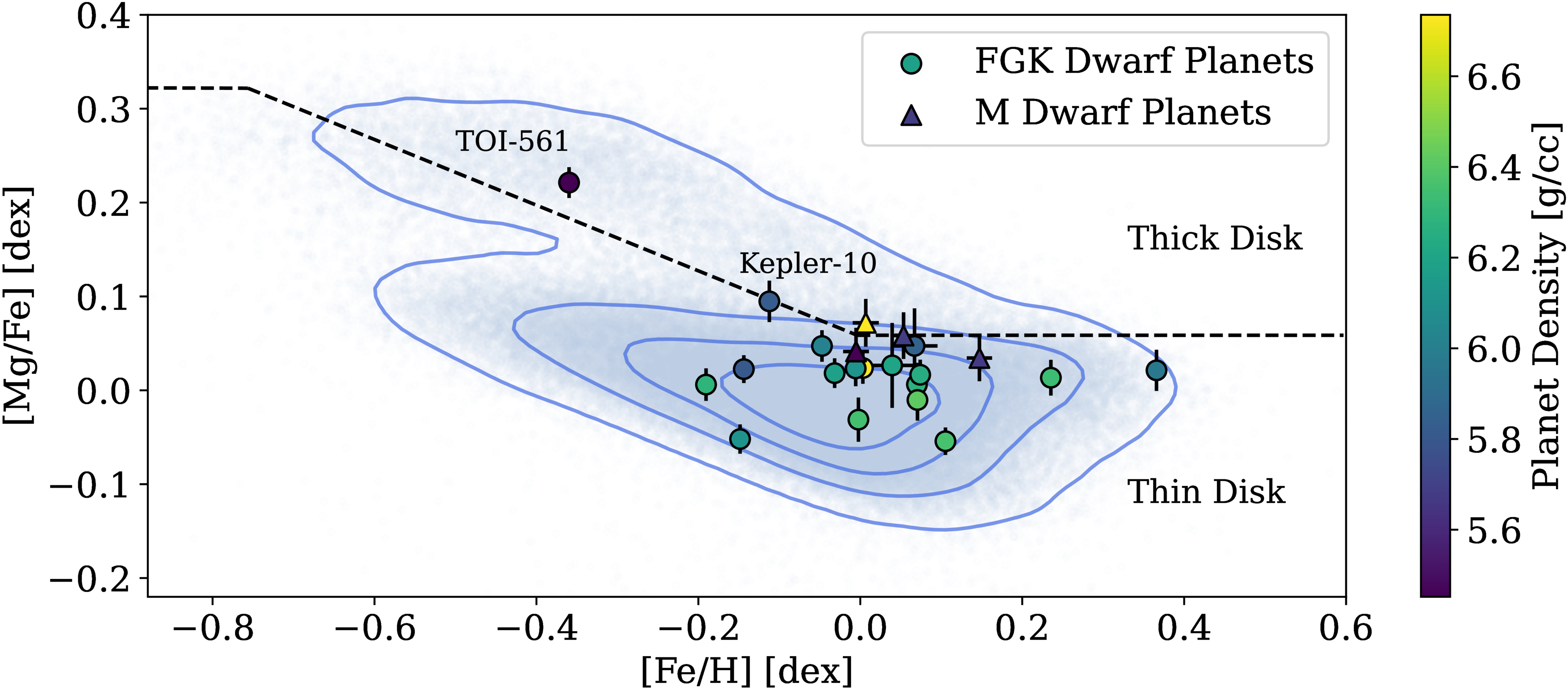 [Mg/Fe] vs. [Fe/H] for stars that host our rocky planet sample, as well as all main-sequence dwarfs in SDSS-V with reliable abundances. The SDSS-V dwarfs are plotted in the background as transparent blue dots, while the FGK and M dwarfs that host our rocky planet sample are marked as circles and triangles, respectively, and are colored by the densities of their rocky planets. The blue contours trace the background star 10% density distribution levels, and the dashed black line delineates the thin–thick disk separation (M. Franchini et al. 2020). TOI-561 and Kepler-10 are highlighted as high-confidence and possible thick disk stars, respectively.