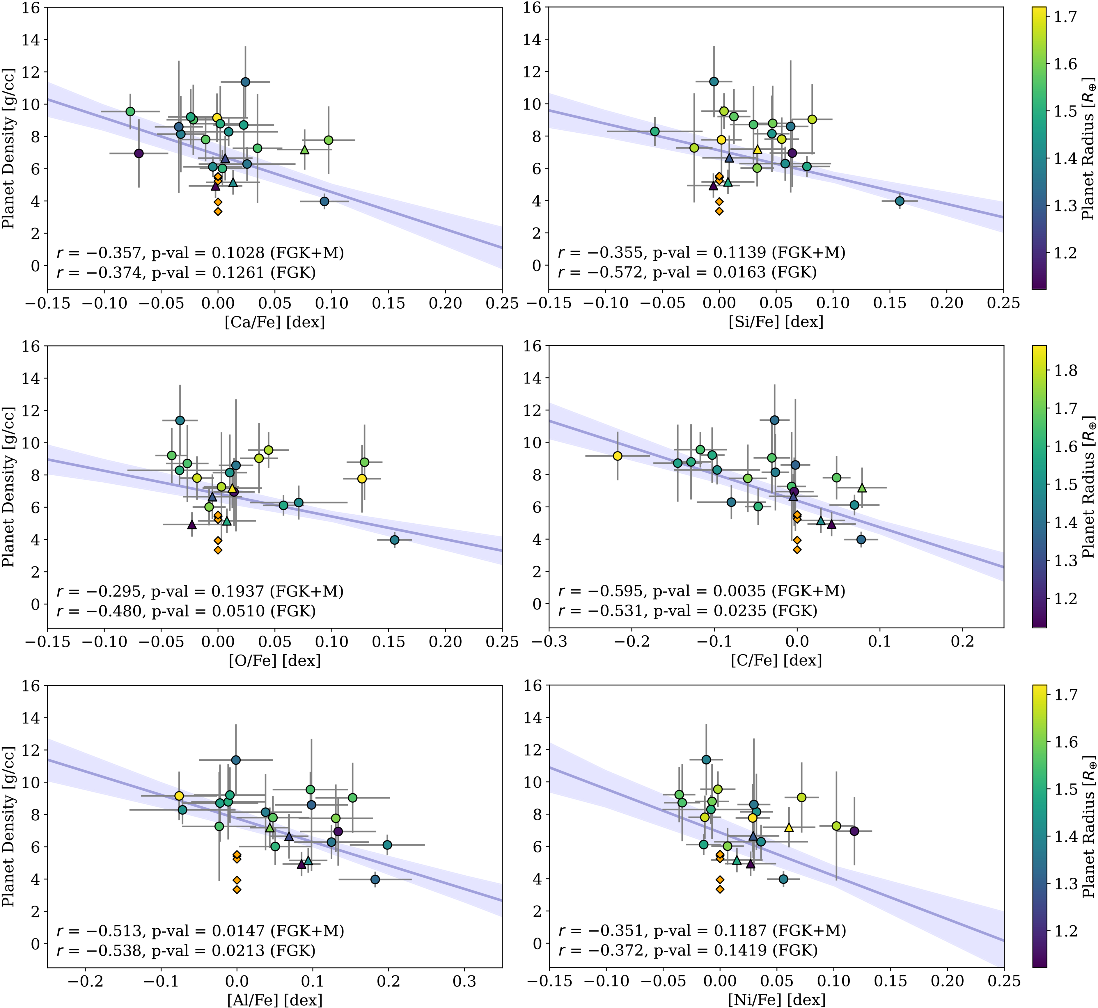 Planet bulk density vs. all rocky elements considered in our analysis in [X/Fe] form. As in Figure 3, rocky solar system bodies (Moon, Mercury, Venus, Earth, and Mars) are plotted for comparison as orange diamonds. Rocky planets hosted by FGK and M dwarfs are denoted as circles and triangles, respectively, and are colored by planet radii values. The best-fit linear trends from our MCMC fitting routine are plotted as blue lines along with their 1σ confidence intervals. We provide the Pearson correlation statistics in the bottom left corners of each panel, considering just the FGK-hosted rocky planets and the entire FGKM sample. TOI-1347 b is not present in the Si, O, and Ni panels because it has unreliable host star abundances for these elements.