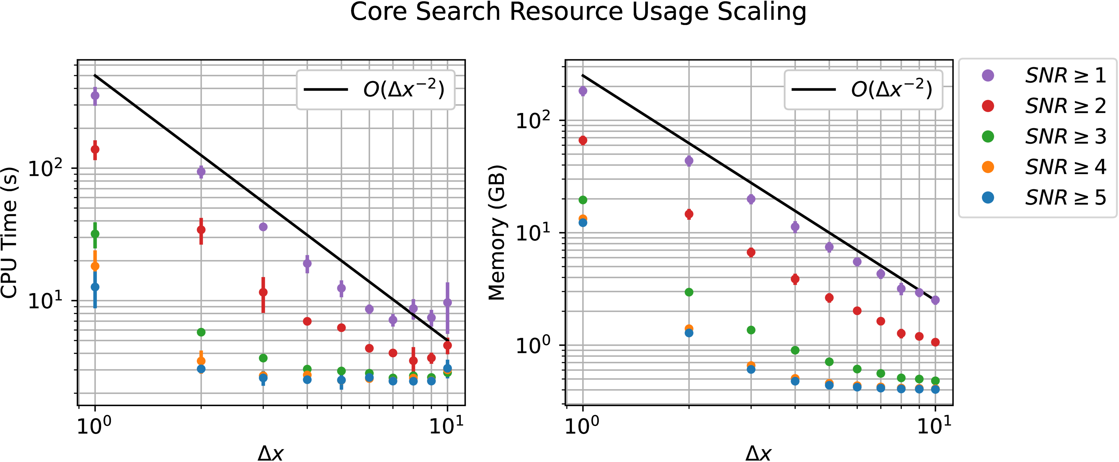 The CPU time and memory usage of the core-search component of our algorithm as a function of the Δx value and the SNR of the catalog searched. The black lines represent the predicted scaling of CPU time and memory with Δx−2.