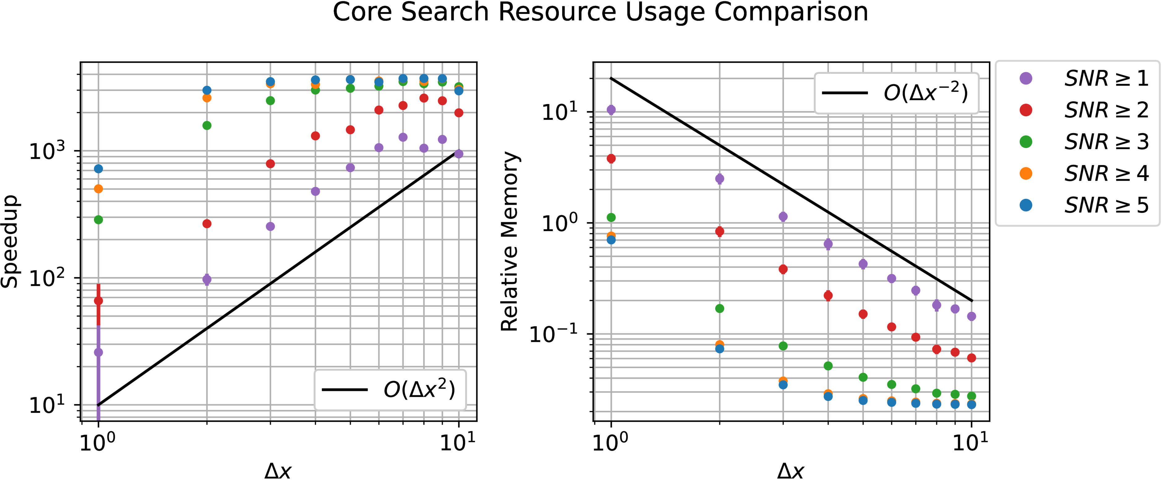 The relative core-search CPU time (speedup) and memory usage of our algorithm compared to an implementation of an image-based shift-and-stack search. The black lines represent the predicted scaling of speedup and memory with Δx2 and Δx−2, respectively.