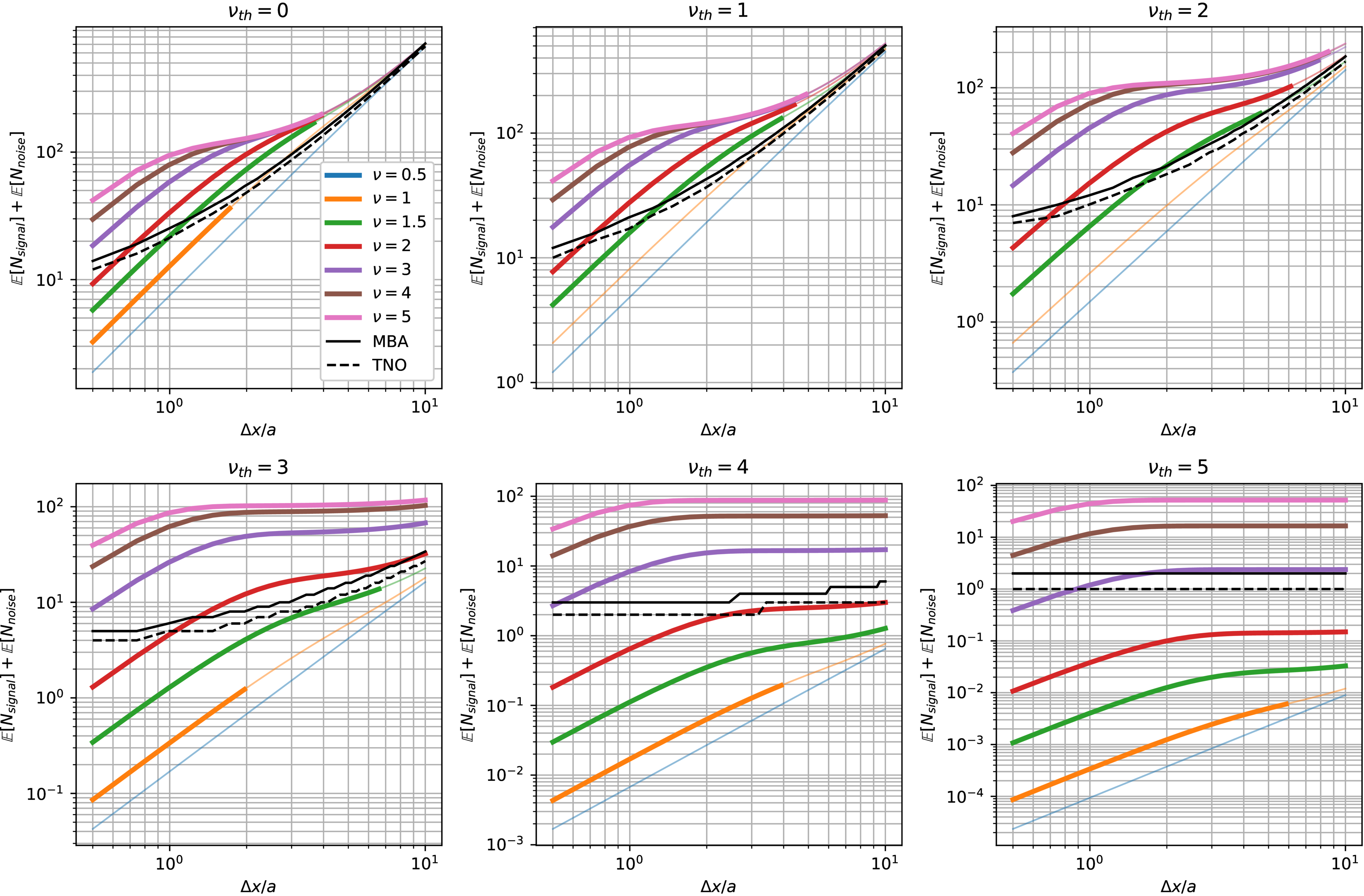 The expected number of detection counts in a bin of size Δx for objects of different SNR ν found in catalogs of different SNR thresholds νth. Thick (thin) colored lines approximately indicate when the expected number of signal detections will be larger (less) than the expected number of noise detections, i.e., when ﹩{\mathbb{E}}[{N}_{{\rm{signal}}}]/{\mathbb{E}}[{N}_{{\rm{noise}}}]\gt 1﹩ (or <1), indicating when a single object of the given SNR ν is distinguishable from noise in a stack of the detection catalog that corresponds to the given object’s trajectory. Black solid (dashed) lines indicate values of ﹩{N}_{{\rm{\min }}}﹩ that produce a false-positive rate of ϵ = 100/Nstacks in an example MBA (TNO) search covering Ω = 162 arcmin2 with a = 1″ seeing and a Δt = 4 hr time baseline. Colored lines lying in regions of the parameter space ﹩{N}_{\min }={\mathbb{E}}[{N}_{\mathrm{signal}}]+{\mathbb{E}}[{N}_{\mathrm{noise}}]﹩ and Δx above (below) the black lines represent when objects of the given SNR ν are (un)likely to appear in the results of a search before producing 100 results corresponding to stacks of noise detections.