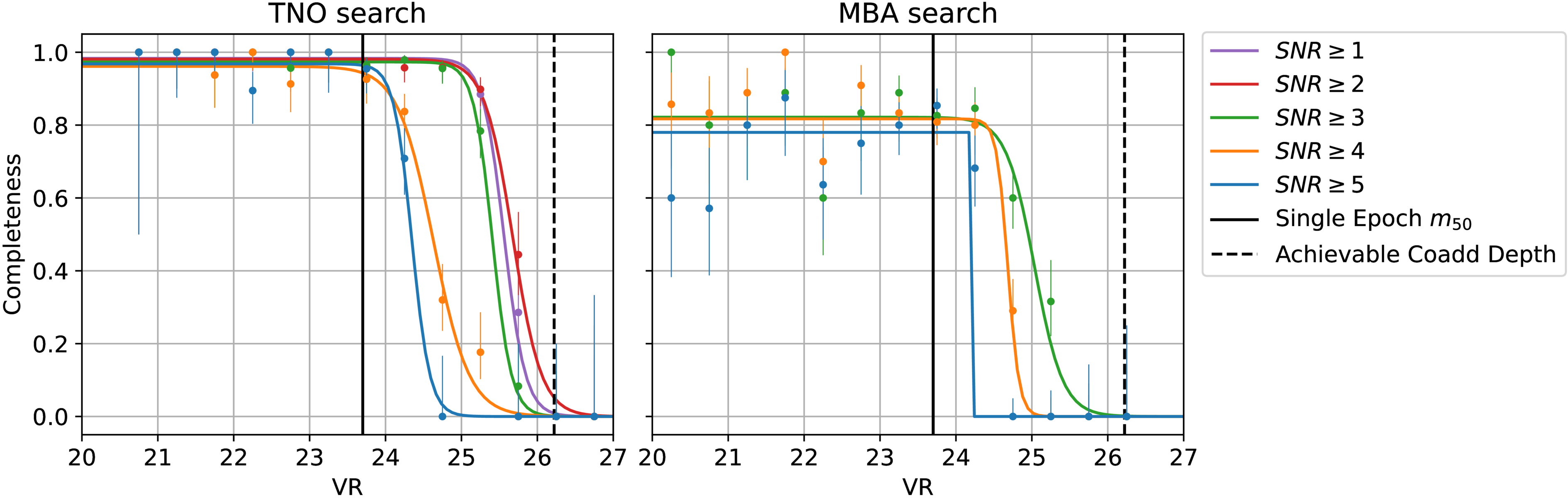 The fraction of synthetic objects recovered as a function of their magnitude for the TNO and MBA searches. Dots represent the detection fraction in bins of size 0.5 mag, and error bars represent the asymmetric uncertainty in the estimated fraction using the Wilson score interval. Two reference magnitudes are visualized as black solid and dashed vertical lines. The solid black line visualizes the estimated single-epoch m50 = 23.7. The dashed black line represents the theoretical achievable depth by coadding all of the images, and it is equal to ﹩{m}_{50}^{{\rm{coadd}}}=26.2﹩.