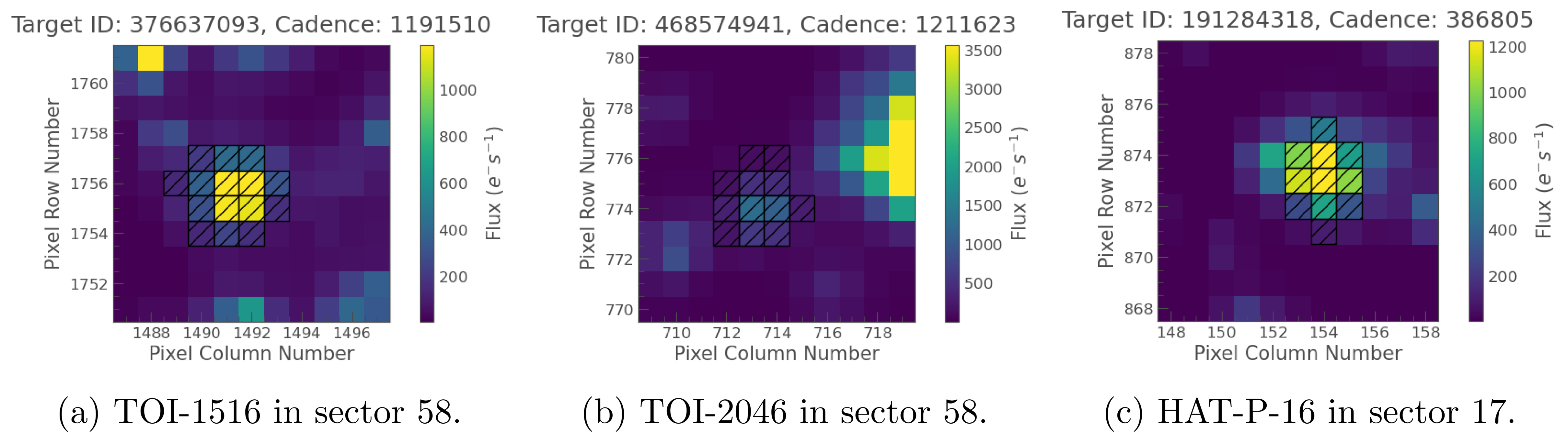 The plot of the target pixel files for TOI-1516 in sector 58 (top), TOI-2046 in sector 58 (middle), and HAT-P-16 in sector 17 (bottom). The black squares represent the chosen optimal photometric aperture utilized for the extraction of the SAP flux. It is important to note that the TESS pixel scale measures 21″.
