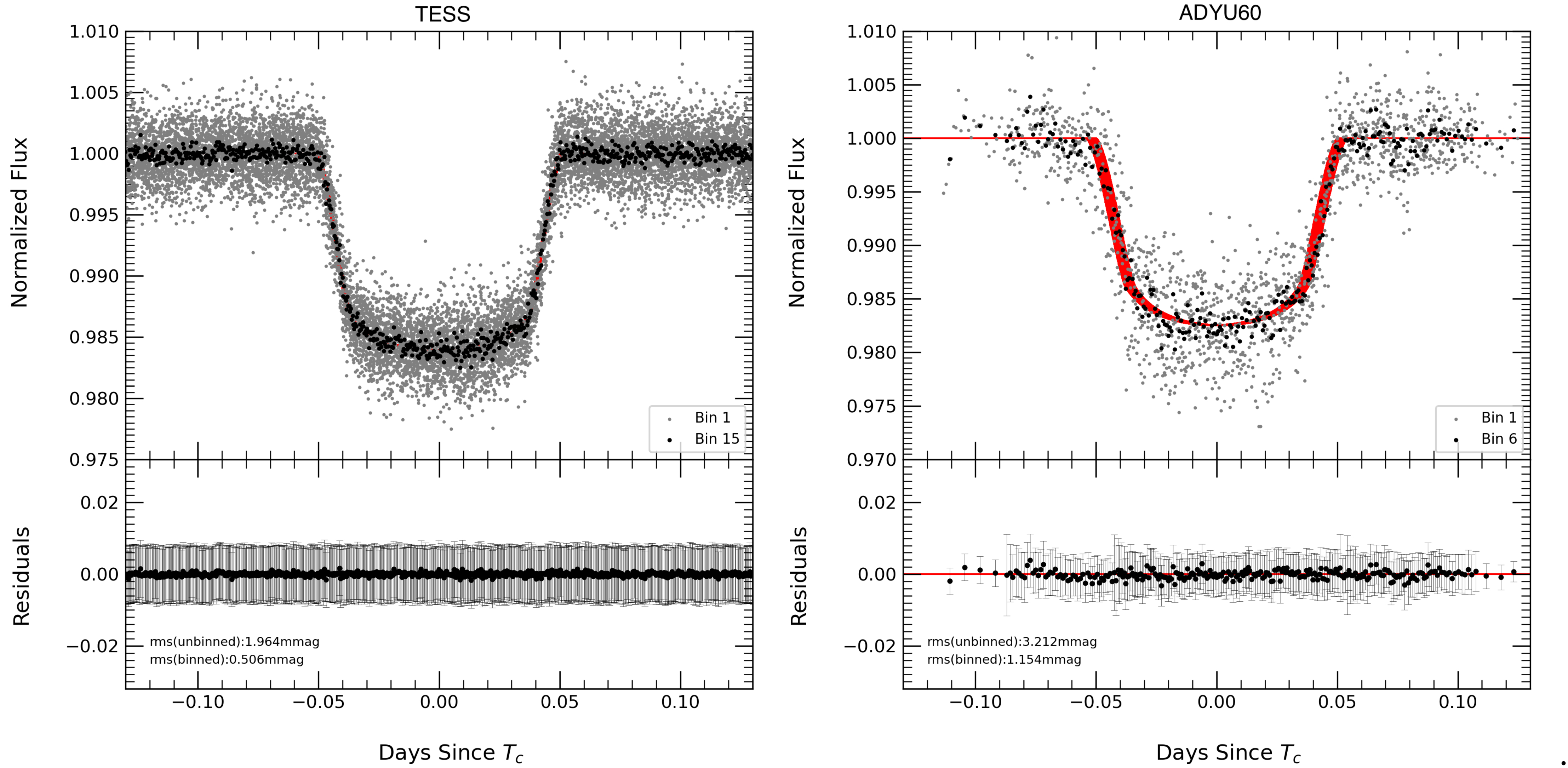 Same as in Figure 6 but for TOI-2046b. Below each flux plot, the residuals for the binned data are displayed with rms values of 0.51 mmag for TESS and 1.15 mmag for ADYU60.