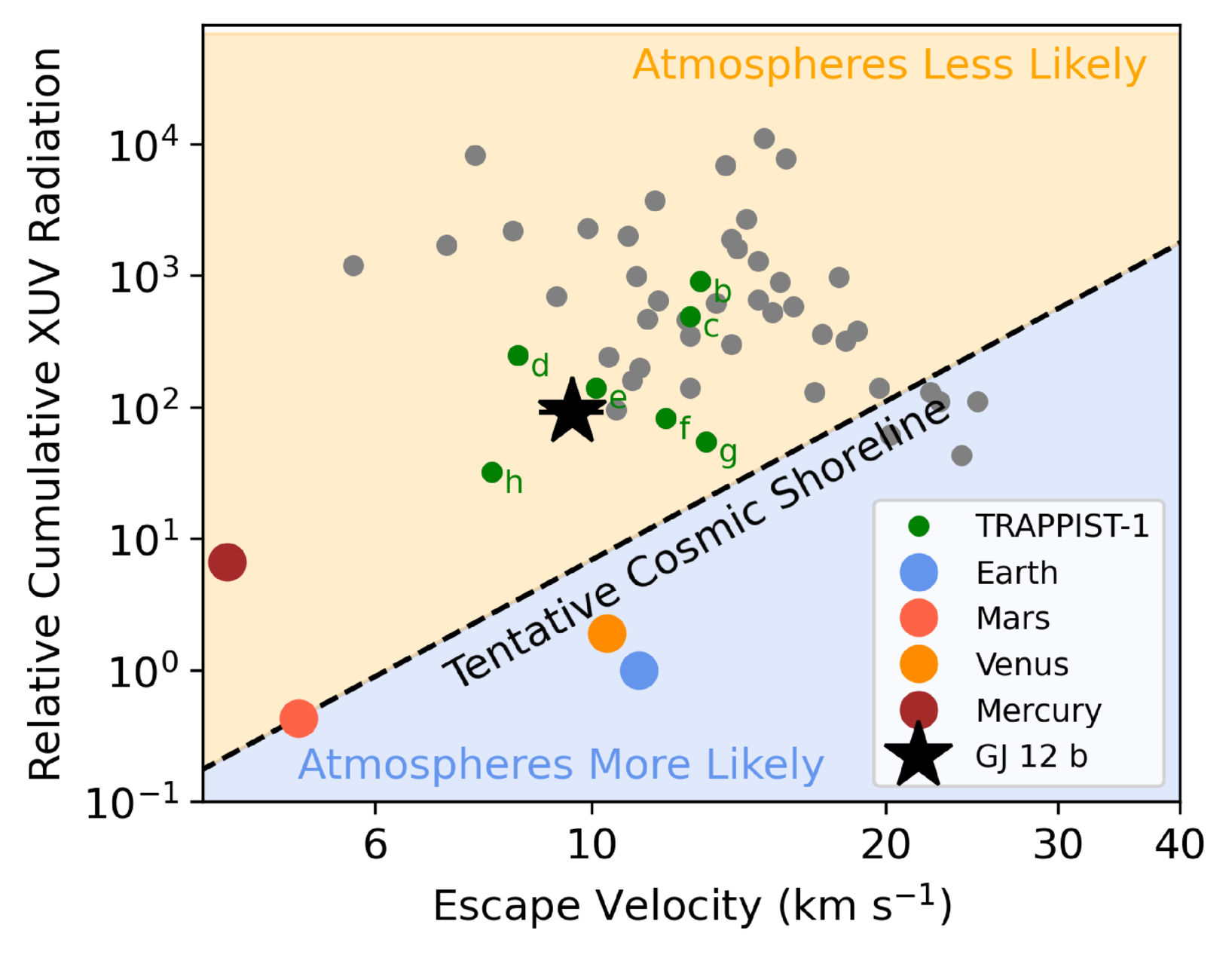 The cosmic shoreline formulation from E. K. Pass et al. (2025) for small planets orbiting mid-to-late M dwarfs within 50 pc, showing our eccentric model for GJ 12 b (black star) in cumulative XUV radiation versus escape velocity space compared to the solar system planets (various colors), TRAPPIST-1 planets (green), and other planets with Rp < 1.8 R⊕ (gray). The location of the tentative shoreline is placed based on what we know from the solar system, with Mars on the shoreline while Mercury is airless.