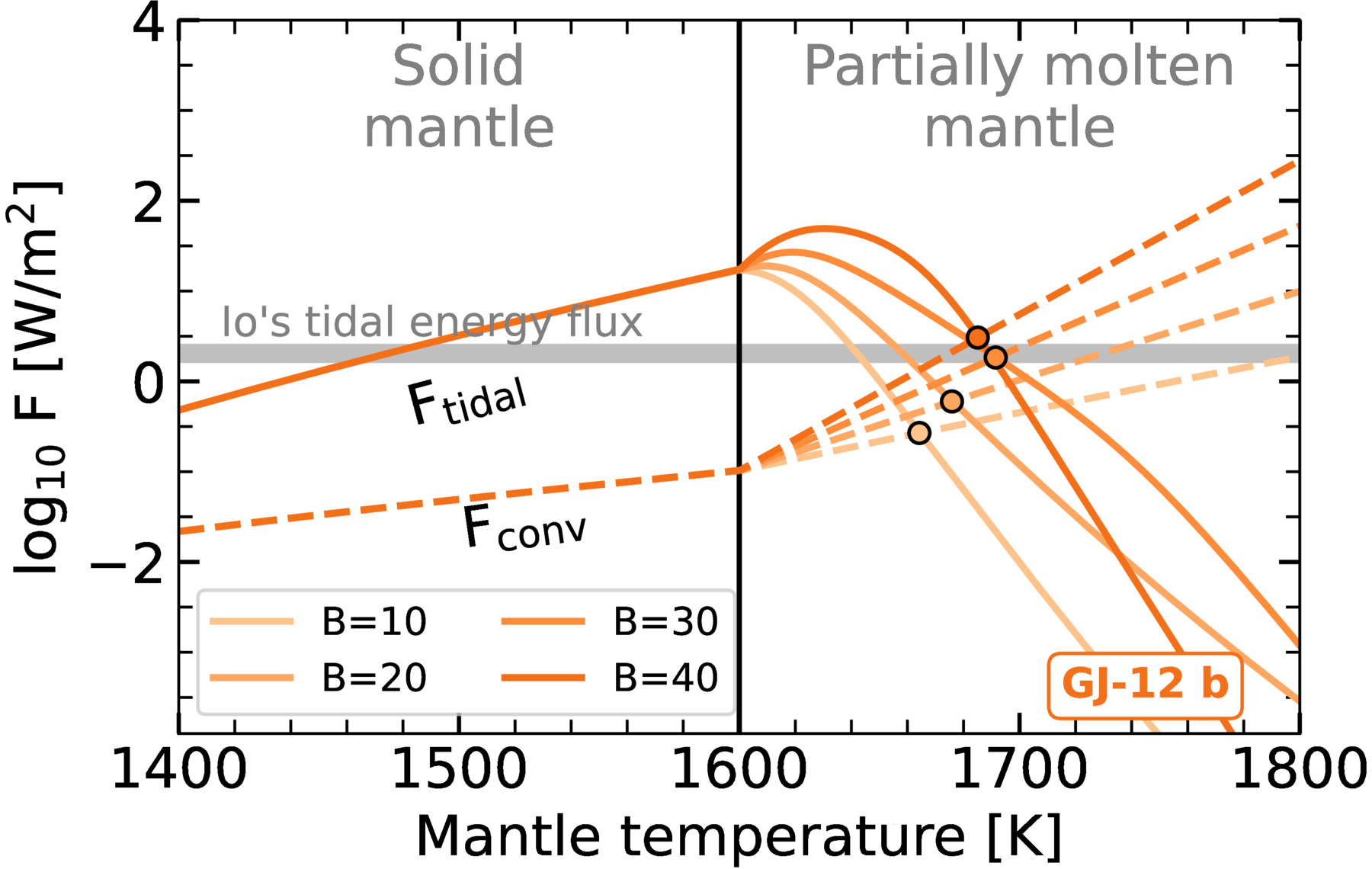 Illustration of the internal energy balance calculation with melt for GJ-12 b. We illustrate the calculations of both Fconv (dashed) and Ftidal (solid lines) as a function of mantle temperature, with equilibria highlighted for each B value with black circles. The constraints on tidal heating fluxes on Jupiter’s moon Io are shown as a gray shaded region (G. J. Veeder et al. 2012).