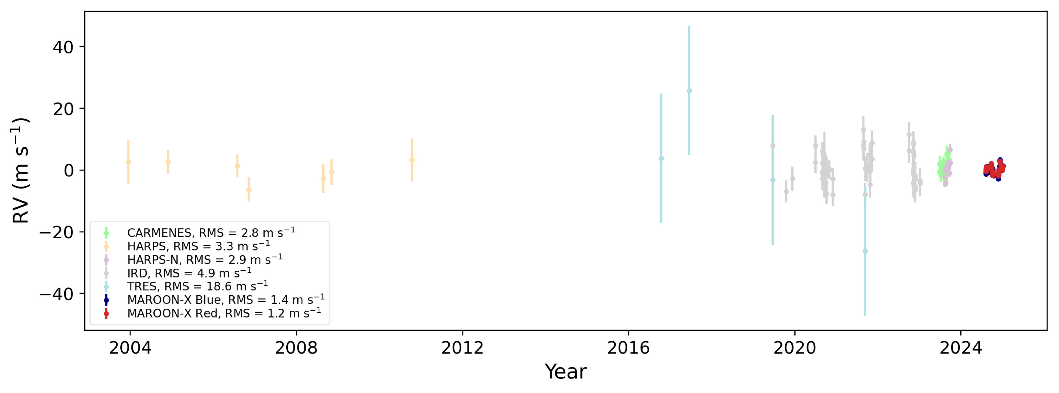 All of the RVs used in our analysis. Each data set shown is mean-subtracted to highlight the relative changes in RV of the star. We have also subtracted the etalon drift slope and offsets (calibrated using those from HD 3651; see Section 4.1 for more details) from the MAROON-X data. Our MAROON-X data have a much smaller scatter than the data from other instruments, indicating that our MAROON-X data will provide much more constraining power than previous observations.