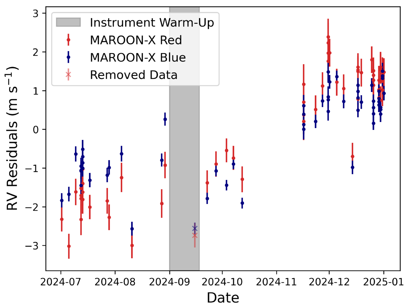 The MAROON-X RVs collected on calibrator star HD 3651 in 2024, with the RV model for the eccentric planet from R. Basant et al. (2025a) subtracted. It is obvious that there is a slope in the RV residuals, as well as a potential offset around the time of the temperature anomaly.
