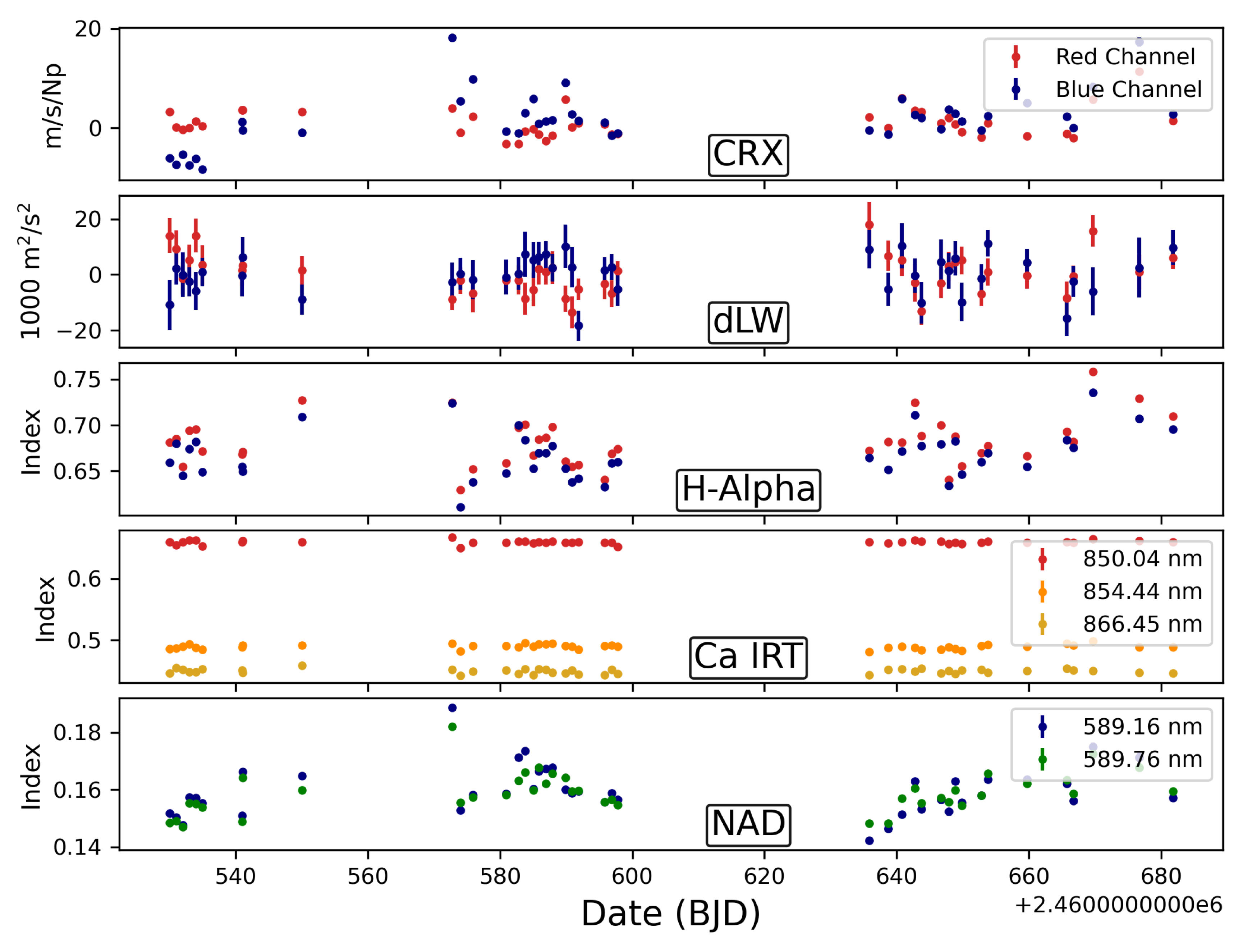 The serval-calculated activity indicators from our MAROON-X data. From the top to bottom panel, these are: the chromatic index in the red and blue channels, the differential line width in the both channels, the hydrogen alpha line index in both channels, the three calcium infrared triplet line indices (8500.4, 8544.4, and 8664.5 Å), and the two sodium doublet line indices (5891.6 and 5897.6 Å).