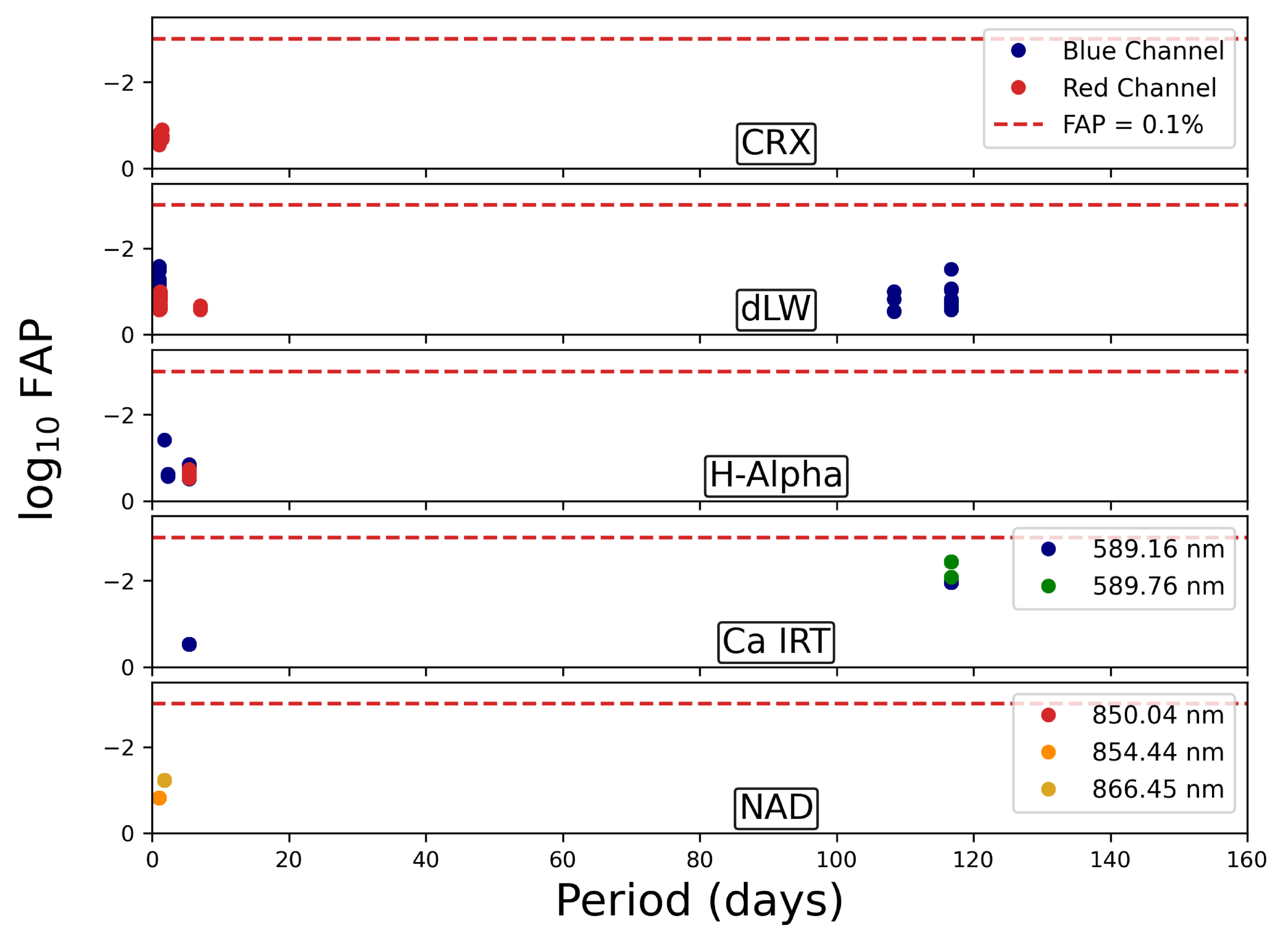 The ℓ1 periodogram analysis of the GJ 12 MAROON-X activity indicators. The figure shows the identified significant periods of the top 1% of noise models (in terms of cross-validation scores) for our RV data and identifies their false-alarm probabilities (FAPs) in the data. We include a red dashed line to indicate the 0.1% FAP level. From the top to bottom panel, these are: the chromatic index in the red and blue channels, the differential line width in the both channels, the hydrogen alpha line index in both channels, the three calcium infrared triplet line indices (8500.4 Å, 8544.4 Å, and 8664.5 Å), and the two sodium doublet line indices (5891.6 Å and 5897.6 Å). In general, we see that none of the activity indicators have any signals with an FAP < 0.1%, meaning that we cannot identify the stellar activity period from this data set.