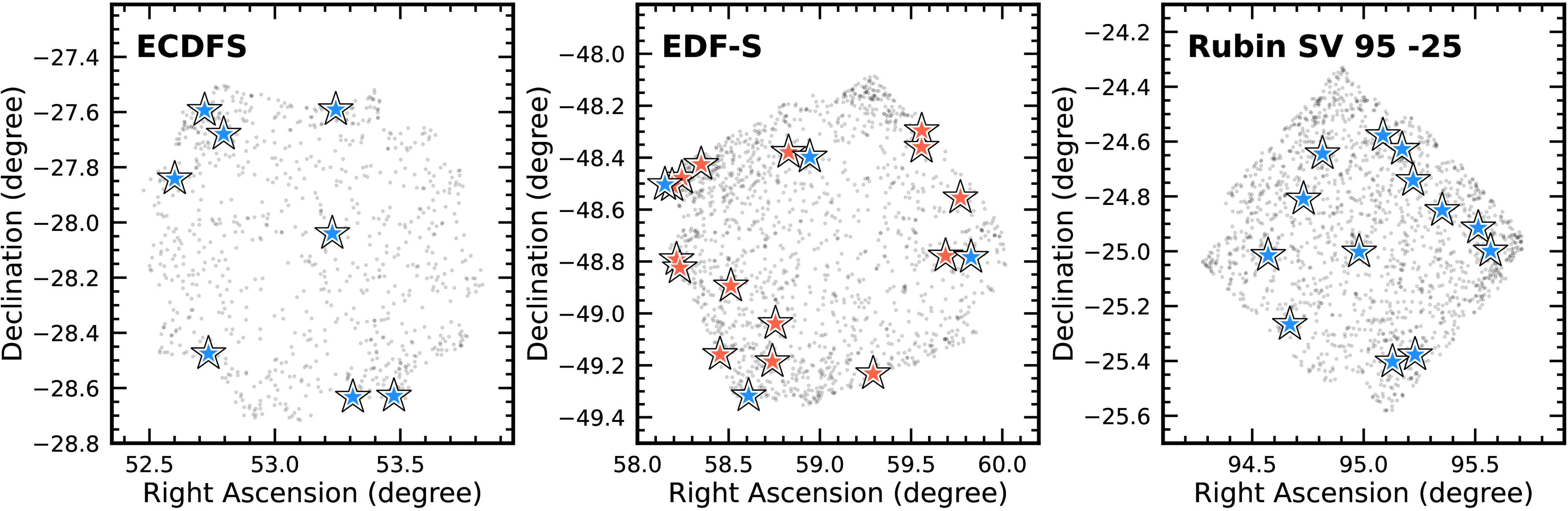 Coordinates of the initial candidates (Section 4) selected from LSST DP1, VHS, and CatWISE (gray circles) within the Extended Chandra Deep Field South (ECDFS; left), Euclid Deep Field South (EDF-S; middle), and a field at low Galactic latitude (Rubin SV 95 -25; right). Orange stars mark the ultracool dwarf discoveries confirmed by Euclid spectroscopy, all located in the EDF-S field (Section 6). These discoveries span spectral types M6–L2. Guided by the Euclid spectroscopic validation of the USMILE models, we further identify a set of high-quality M6–L9 candidates that lack high-S/N Euclid spectroscopy (Section 7), shown as blue stars.
