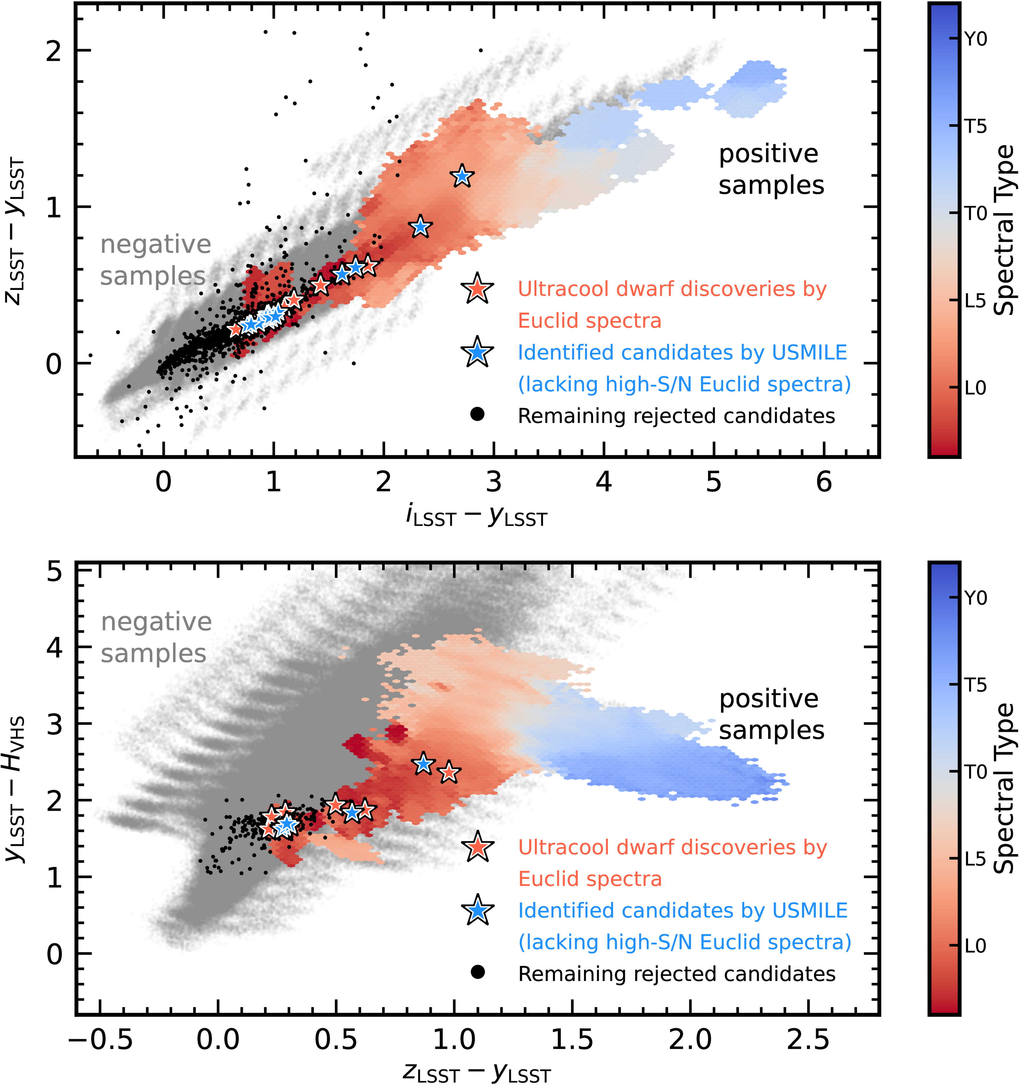 Top panel: the iLSST − yLSST and zLSST − yLSST colors for the positive (colored) and negative (gray) samples in our labeled data set, with positive samples color-coded by spectral types. The 15 ultracool dwarf discoveries confirmed with Euclid spectroscopy are shown as orange stars (Section 6). For objects lacking high-S/N Euclid spectra, we identify 25 high-quality candidates based on our USMILE models, shown as blue stars (Section 7). The remaining rejected candidates are shown as black circles. Bottom panel: the zLSST − yLSST and yLSST − HVHS colors for objects plotted in the top panel.