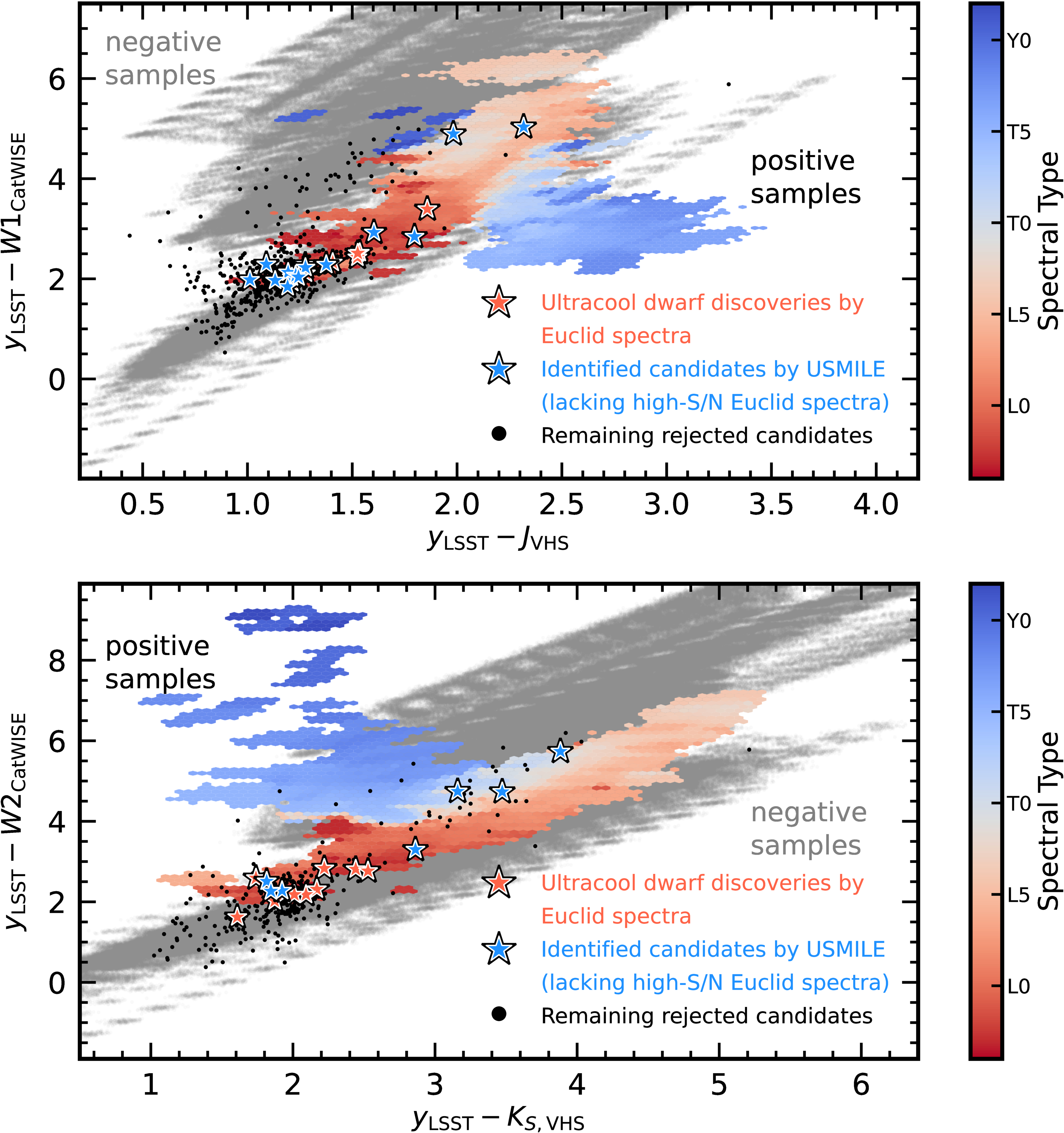 The yLSST − JVHS and yLSST − W1CatWISE colors (top), as well as the yLSST − KS,VHS and yLSST − W2CatWISE colors (bottom), for the same types of object as plotted in Figure 11.