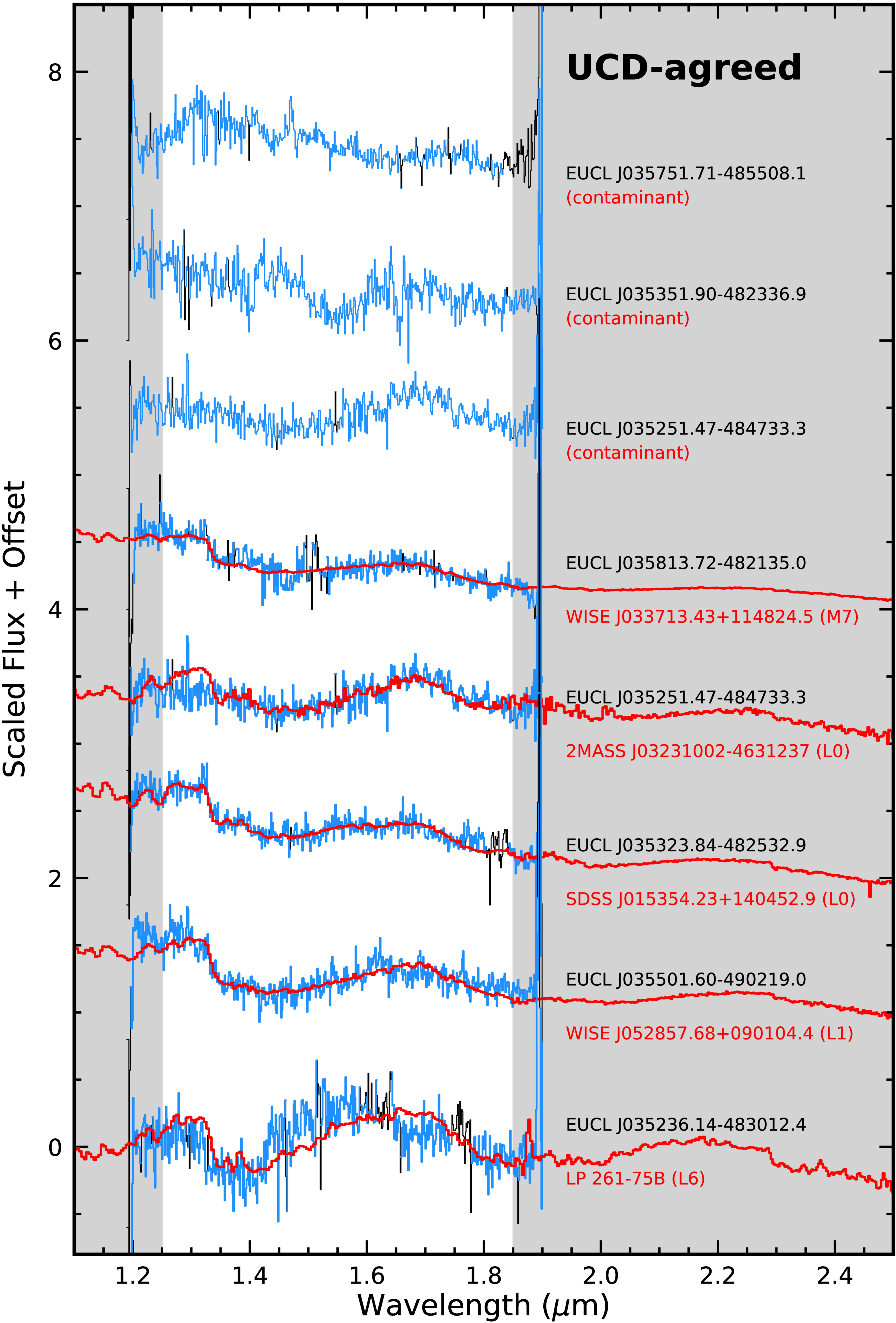 Euclid NISP spectra for example candidates from the UCD-agreed category, with the format following that of Figure 13. The spectrum of the last candidate, EUCL J035236.14−483012.4, only has a J-band S/N of 4.7. Although this S/N is lower than the threshold we adopt for performing template fitting analysis, we find its spectrum is similar to that of an L6 template. We keep this object as an ultracool dwarf candidate; high-quality spectroscopy is warranted to refine its spectral type and confirm its nature.