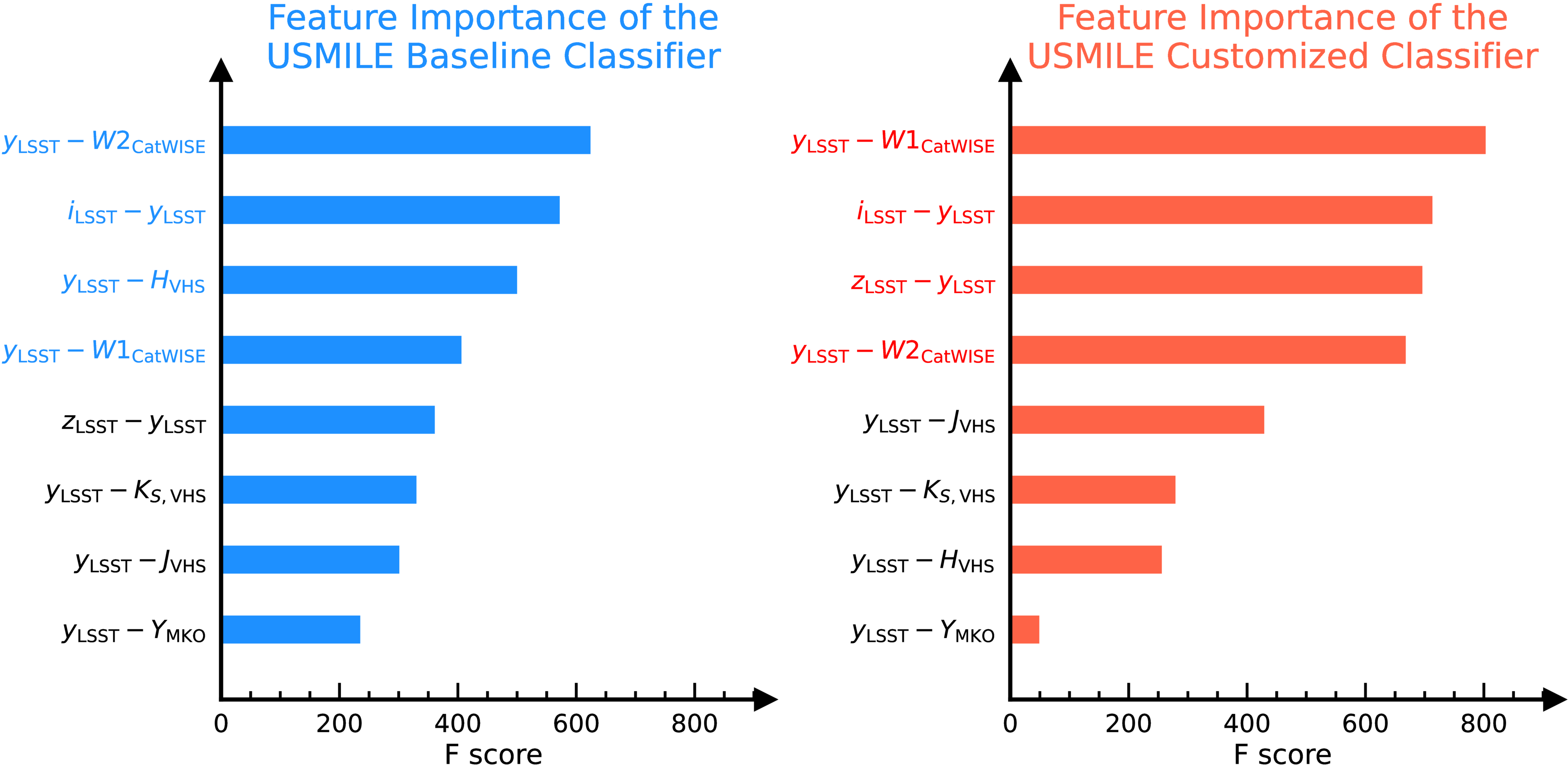 Feature importance for the USMILE baseline classifier (left) and customized classifier (right), ranked by XGBoost F scores (i.e., the frequency with which each feature is used to split the data across all trees). The four most influential features for each classifier are highlighted in color.