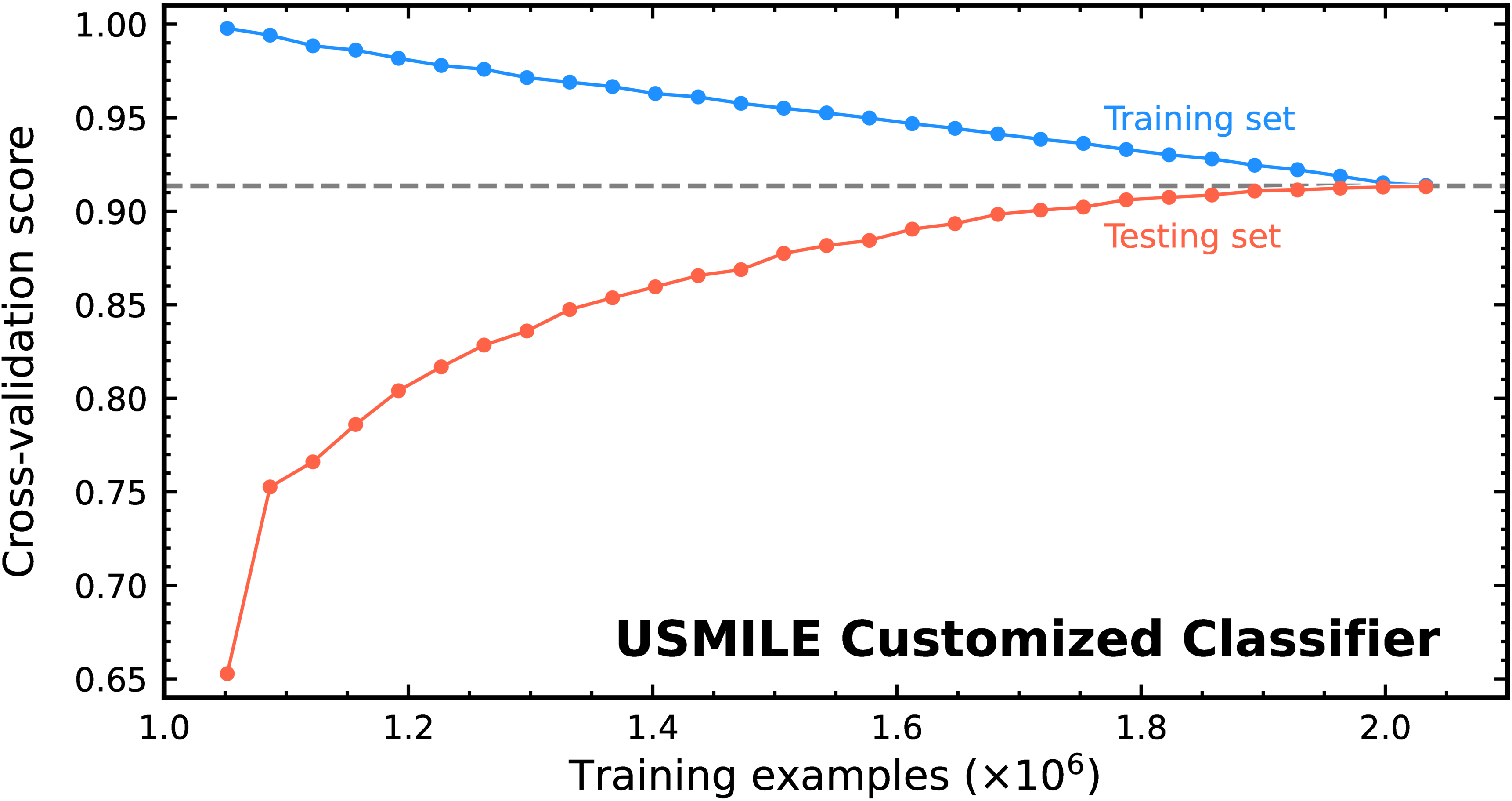 Learning curves of a representative USMILE customized classifier, showing cross-validation scores for the training set (blue) and testing set (red). These scores are computed using fivefold stratified cross-validation with shuffling to preserve class balance across folds. The two curves converge at large sample sizes near 0.91, demonstrating the model’s strong generalization performance with a well-balanced bias–variance trade-off.