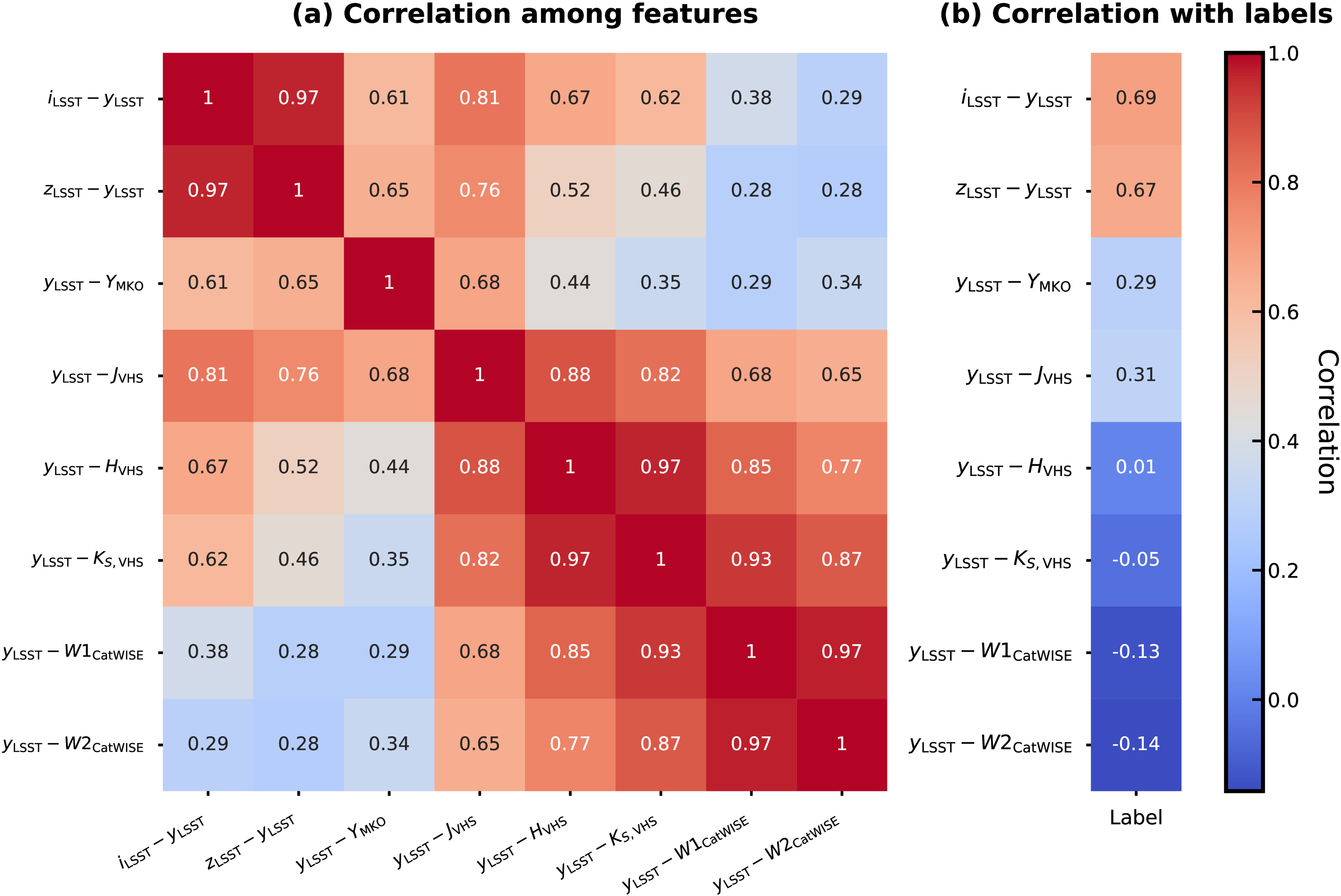 Linear correlations among the eight color features (left) and between each feature and the labels (right), where labels indicate whether a source is a genuine ultracool dwarf or a stellar/extragalactic contaminant. Pearson correlation coefficients are labeled.