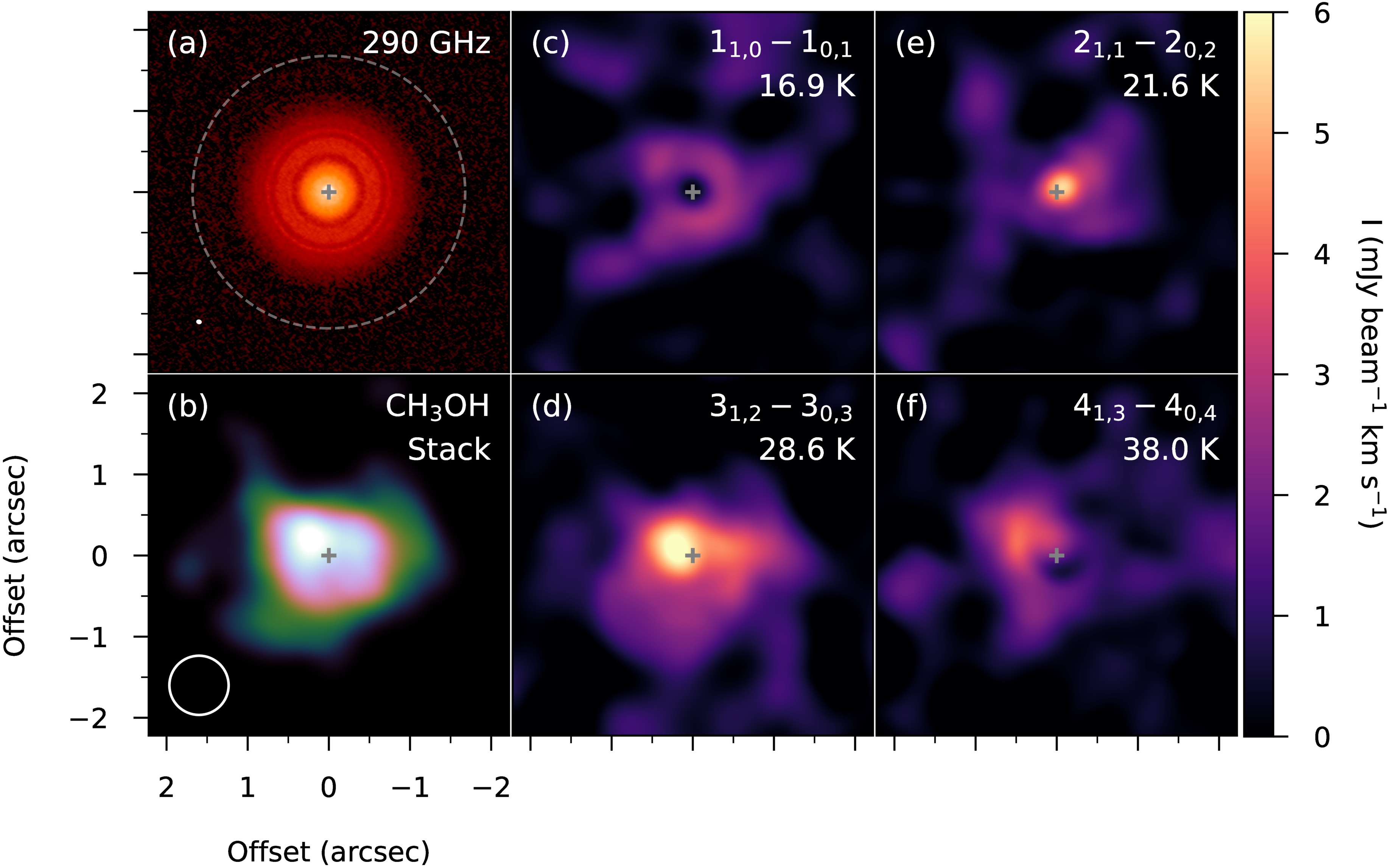 Morphology of the methanol (CH3OH) emission toward TW Hya. (a) 290 GHz continuum emission from J. Huang et al. (2018) overlaid with the dust disk extent derived from our observations in J. D. Ilee et al. (2022; dashed ellipse). (b) Integrated intensity map of the ﹩0\mathop{.}\limits^{^{\prime\prime} }7﹩ stacked methanol transitions. (c)–(f) As (b), but for the individually detected transitions.