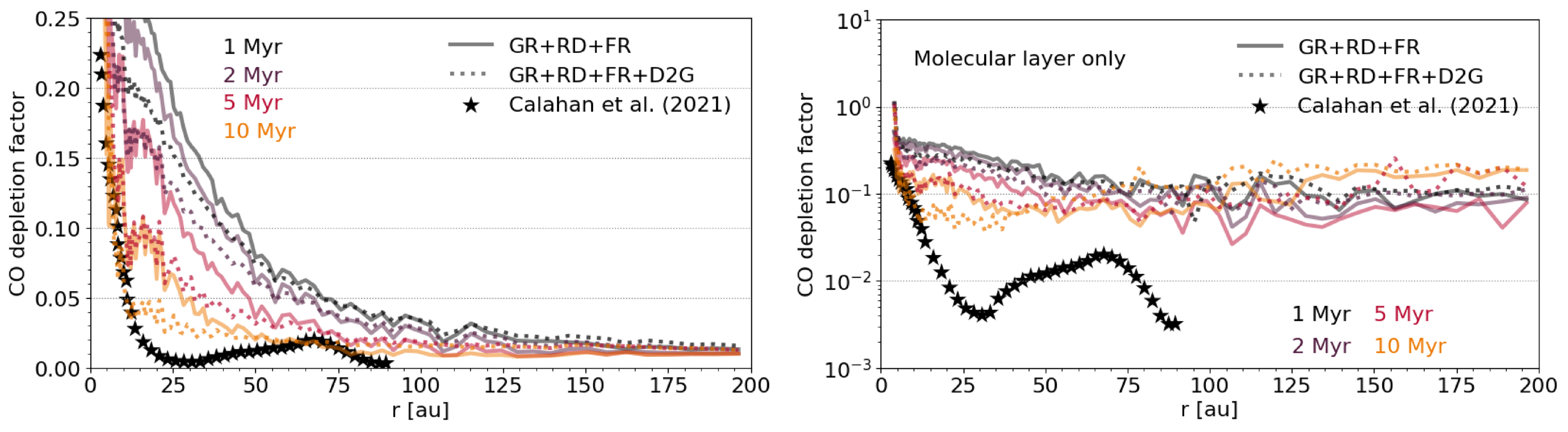 CO depletion factor as a function of radius, r, at 1, 2, 5, and 10 Myr for the model that includes grain-surface chemistry, reactive desorption, and fractal grains (GR+RD+FR; solid lines), and the same model but also scaling the ice mass by the dust-to-gas mass ratio (GR+RD+FR+D2G; dotted lines). The empirically derived CO depletion factors from J. K. Calahan et al. (2021) are overlaid in black stars. The left-hand panel shows the ratio of gas-phase CO to H2 for the full vertical extent of the disk, whereas the right-hand plot shows that calculated for the molecular layer only (i.e., restricting the calculation to above the CO snow surface only).