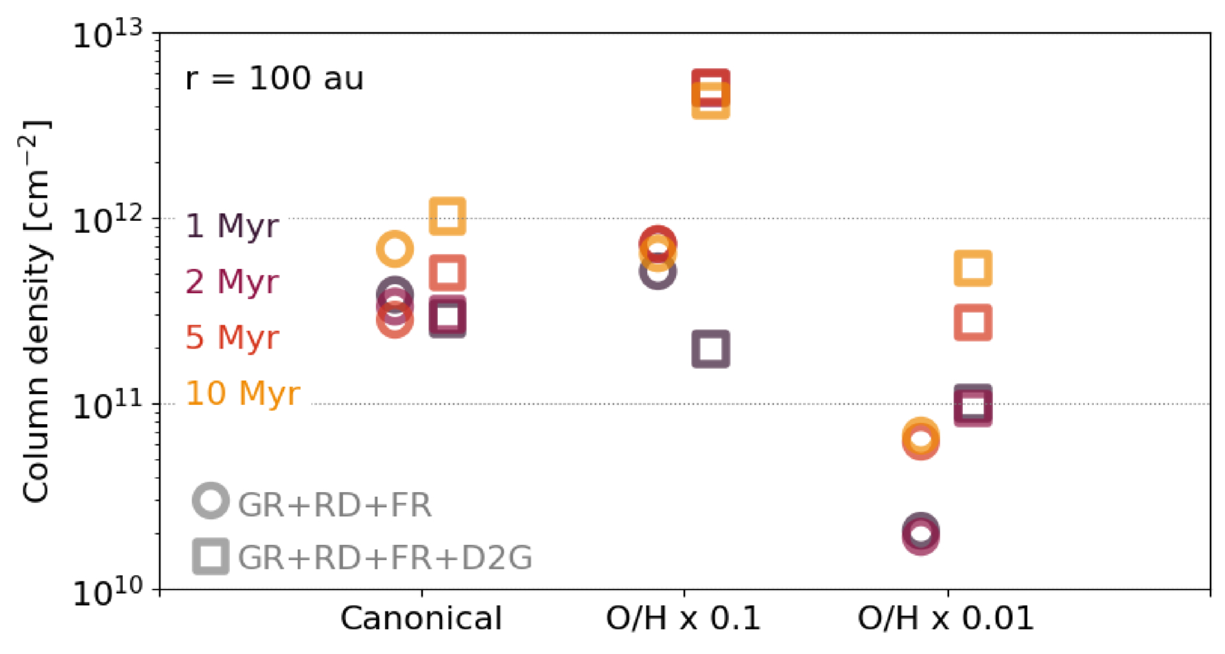 Column density of gas-phase methanol (CH3OH) at a radius of 100 au for the canonical elemental abundances (C/O = 0.43; O/H = 3.2 × 10−4), and two models where oxygen is globally depleted by factors of 10 and 100 and C/O is set to 2. Shown are the results for the models with grain-surface chemistry, reactive desorption, and fractal grains, and with (GR+RD+FR+D2G) and without (GR+RD+FR) ice-to-gas mass scaling.