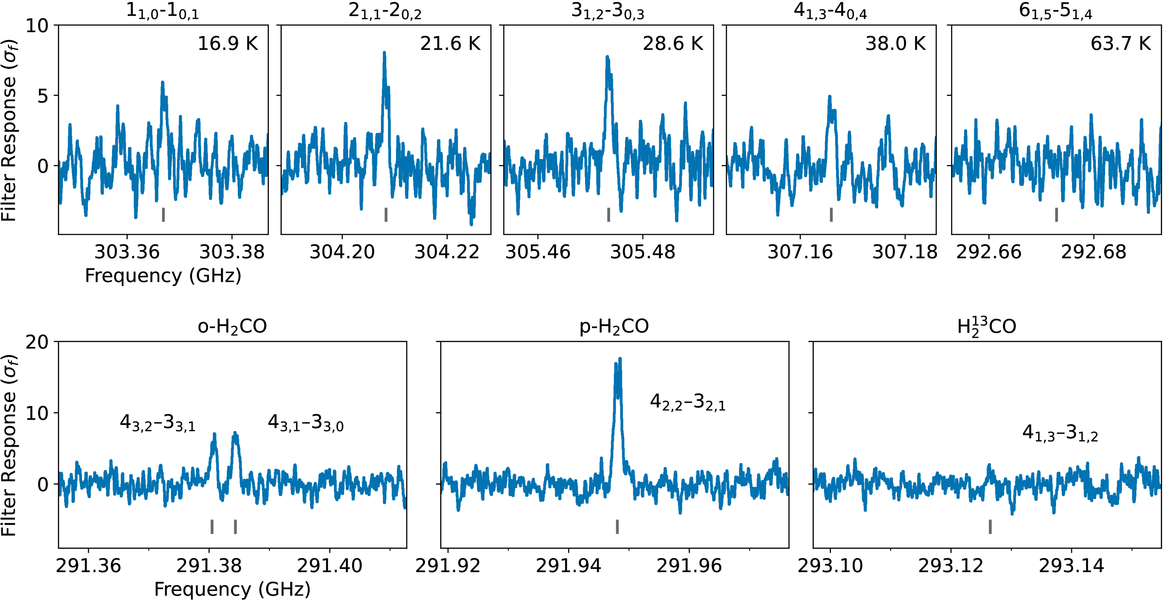 Matched filter response across the spectral windows containing methanol (CH3OH) transitions using a Keplerian mask with a radius of 50 au (top) and the remaining spectral windows with a mask of radius 100 au (bottom). Rest frequencies of the labeled transitions are marked with vertical dashes. See J. Terwisscha van Scheltinga et al. (2021) for an analysis of the H2CO emission.