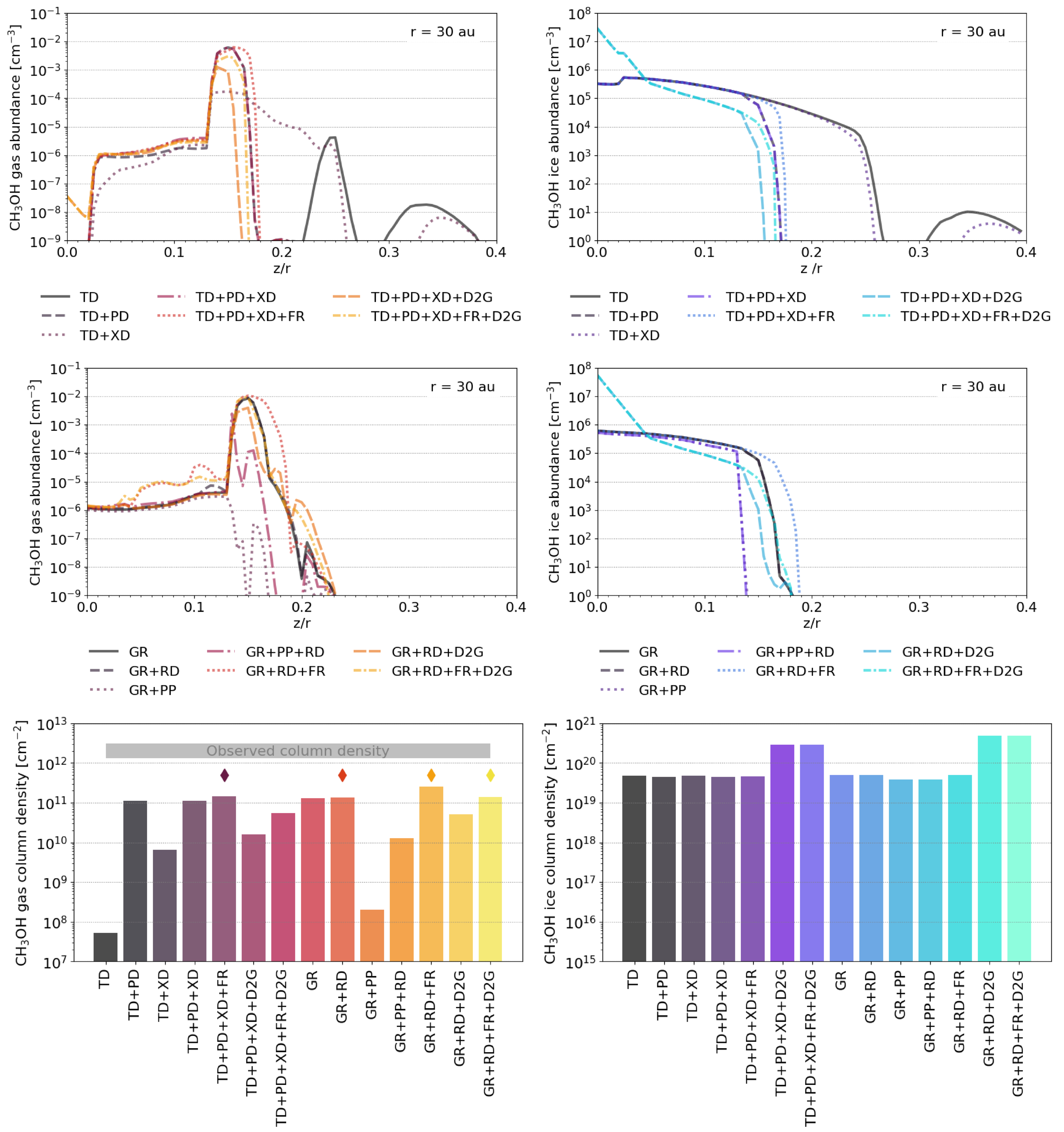 Abundance (top and middle; cm−3) and column density (bottom; cm−2) of methanol gas (left) and ice (right) as a function of z/r (i.e., height divided by radius) at a radius of 30 au. The top row shows results from models with thermal desorption only (TD), with the addition of photodesorption (+PD) and X-ray desorption (+XD), treating the grains as fractal (+FR) and scaling the ice mass by the dust-to-gas mass ratio (+D2G). The middle row shows the results from models, also including all listed desorption mechanisms and grain-surface chemistry (GR), with the addition of reactive desorption (+RD), photo-processing of the ice (+PP), treating the grains as fractal (+FR), and scaling the ice mass by the dust-to-gas mass ratio (+D2G). The disk-averaged column density of gas-phase methanol derived from the observations (﹩1.{8}_{-0.5}^{+1.3}\times 1{0}^{12}﹩ cm−2) is shown by the gray box in the bottom left plot. The starred models in the bottom left plot are those for which the methanol gas column density is highest and thus for which the full models were run.
