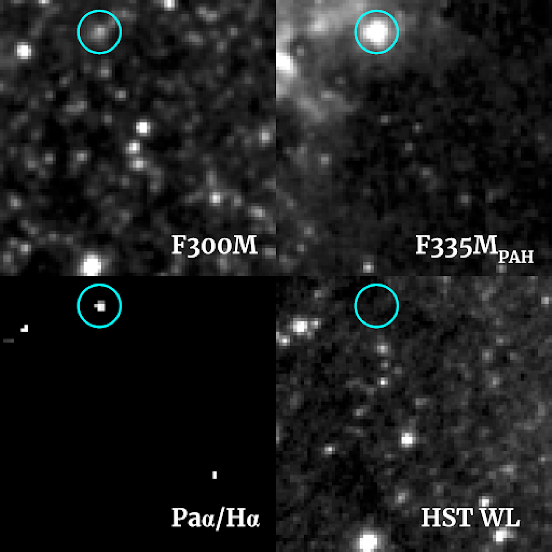 An example of an embedded cluster candidate in NGC 3059, denoted by the cyan circle. This source displays point-like emission in F300M and F335M, a significant Pα/Hα excess indicating high levels of extinction, and no visible emission in our HST white-light image. Ideal candidate examples from four galaxies are shown in Appendix A.